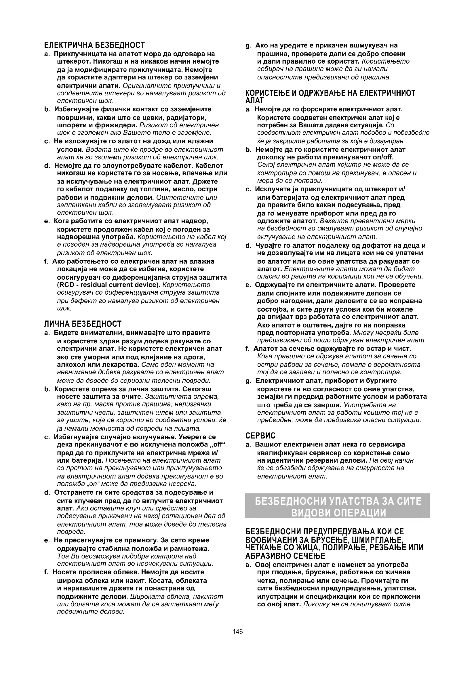 ПРЕДУПРЕДУВАЊЕ ПРОЧИТАЈТЕ ГИ СИТЕ БЕЗБЕДНОСНИ ПРЕДУПРЕДУВАЊА И СИТЕ УПАТСТВА Ако не се следат предупредувањата и упатствата, може да дојде до струен удар, пожар и/или сериозна повреда. Чувајте ги сите предупредувања и упатства за идно користење. Изразот „електричен алат“ во предупредувањата се однесува на електричниот алат кој се приклучува на електрична мрежа (со кабел) или на електричен алат со батерија (без кабел). БЕЗБЕДНОСТ НА РАБОТНИОТ ПРОСТОР a. Работниот простор одржувајте го чист и добро осветлен. Неуредните и темни работни простори можат да предизвикаат незгоди.b. Не работете со електричниот алат во експлозивна средина, како на пр. во близина на запалливи течности, гасови или прашина. Електричните алати прават искри кои можат да ја запалат прашината или пареата.c. Додека работите со електричниот алат, оддалечете ги децата и другите лица. Невниманието може да биде причина за губење на контролата. 145ЕЛЕКТРИЧНА БЕЗБЕДНОСТ a. Приклучницата на алатот мора да одговара на штекерот. Никогаш и на никаков начин немојте да ја модифицирате приклучницата. Немојте да користите адаптери на штекер со заземjени електрични алати. Оригиналните приклучници и соодветните штекери го намалуваат ризикот од електричен шок. b. Избегнувајте физички контакт со заземјените површини, какви што се цевки, радијатори, шпорети и фрижидери. Ризикот од електричен шок е зголемен ако Вашето тело е заземјено. c. Не изложувајте го алатот на дожд или влажни услови. Водата што ќе продре во електричниот алат ќе го зголеми ризикот од електричен шок. d. Немојте да го злоупотребувате кабелот. Кабелот никогаш не користете го за носење, влечење или за исклучување на електричниот алат. Држете го кабелот подалеку од топлина, масло, остри рабови и подвижни делови. Оштетените или заплеткани кабли го зголемуваат ризикот од електричен шок. e. Кога работите со електричниот алат надвор, користете продолжен кабел кој е погоден за надворешна употреба. Користењето на кабел кој е погоден за надворешна употреба го намалува ризикот од електричен шок. f. Ако работењето со електричен алат на влажна локација не може да се избегне, користете oосигурувач со диференцијална струјна заштита (RCD - residual current device). Користењето осигурувач со диференцијална струјна заштита при дефект го намалува ризикот од електричен