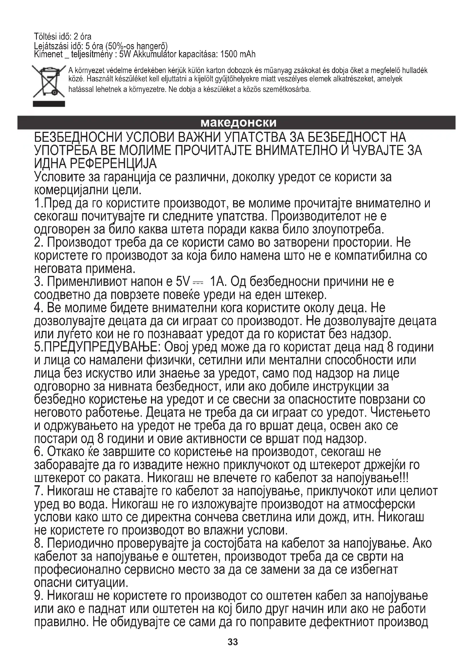 или ако е паднат или оштетен на кој било друг начин или ако не работи правилно. Не обидувајте се сами да го поправите дефектниот производ Töltési idő: 2 óra Lejátszási idő: 5 óra (50%-os hangerő) Kimenet _ teljesítmény : 5W Akkumulátor kapacitása: 1500 mAh34 бидејќи тоа може да доведе до електричен удар. Секогаш вртете го оштетениот уред на професионално сервисно место за да го поправите. Сите поправки можат да ги вршат само овластени сервисери. Поправката што е направена неправилно може да предизвика опасни ситуации за корисникот.