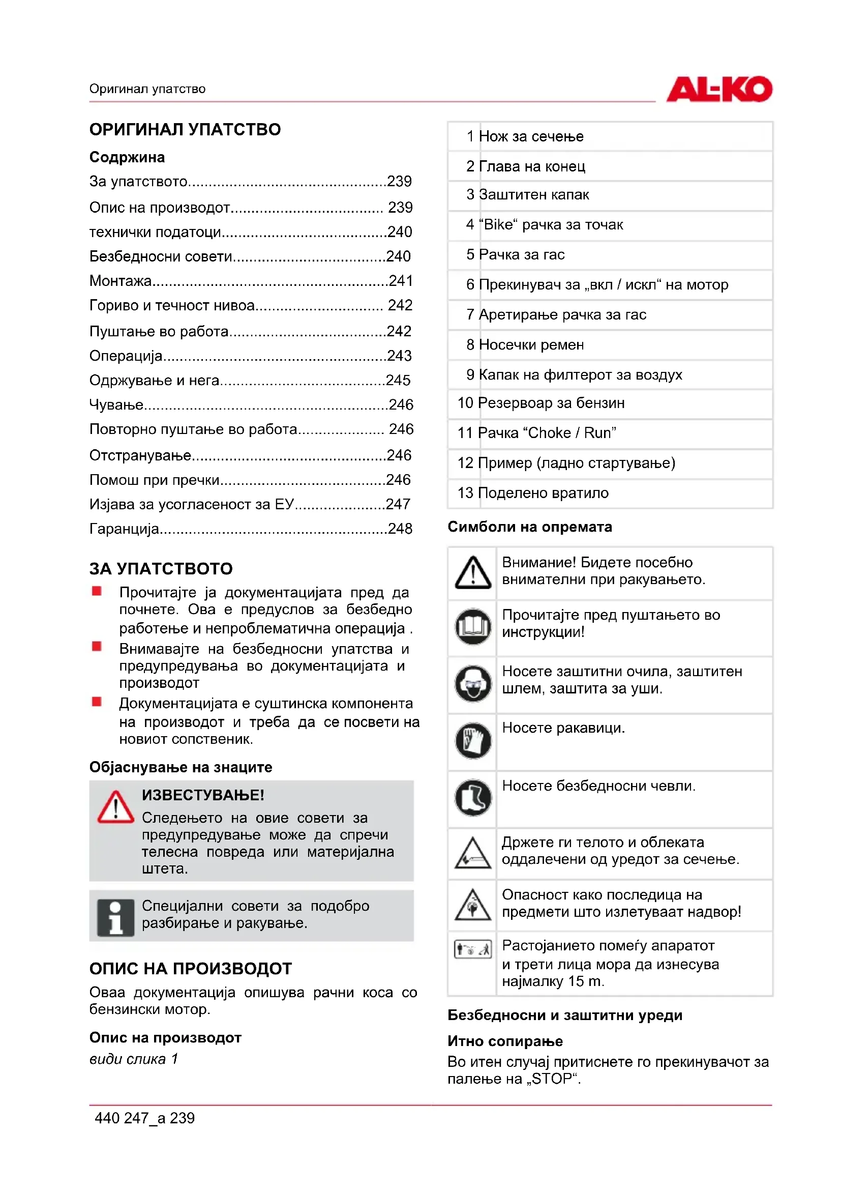 ADVICE Специјални совети за подобро разбирање и ракување. ОПИС НА ПРОИЗВОДОТ Оваа документација опишува рачни коса со бензински мотор. Опис на производот види cлика 1 1 Нож за сечење 2 Глава на конец 3 Заштитен капак 4 “Bike“ рачка за точак 5 Рачка за гас 6 Прекинувач за „вкл / искл“ на мотор 7 Аретирање рачка за гас 8 Носечки ремен 9 Капак на филтерот за воздух 10 Резервоар за бензин 11 Рачка “Choke / Run” 12 Пример (ладно стартување) 13 Поделено вратило Симболи на опремата Внимание! Бидете посебно внимателни при ракувањето. Прочитајте пред пуштањето во инструкции! Носете заштитни очила, заштитен шлем, заштита за уши. Носете ракавици. Носете безбедносни чевли. Држете ги телото и облеката оддалечени од уредот за сечење. Опасност како последица на предмети што излетуваат надвор! 15m(50ft) Растојанието помеѓу апаратот и трети лица мора да изнесува најмалку 15 m. Безбедносни и заштитни уреди Итно сопирање Во итен случај притиснете го прекинувачот за палење на „STOP“.mk Опис на производот 240 BC 4535 II-S Заштитна табличка од удари во камен Заштитете го корисникот од исфрлени предмети. Интегрираниот нож го крати конецот за сечење на допуштената должина. ИЗВЕСТУВАЊЕ! Ризик од повреда! Безбедносните и заштитните уреди не смеат да се исклучуваат. Поделено вратило Благодарение на поделеното вратило, моторната машина за кастрење грмушки може лесно да се склопи, а после кастрењето може лесно да се расклопи и да се смести, така што нема да зазема многу простор. Прописна примена Овој апарат е наменет за уредување и косење тревни површини во приватната сфера. Секоја поинаква употреба што излегува вон тој домен важи за несоодветна. Можна погрешна примена ИЗВЕСТУВАЊЕ! Овој уред не смее да биде користен за комерцијална употреба. ТЕХНИЧКИ ПОДАТОЦИ BC 4535 II Тип на мотор 2-мозочен удар,