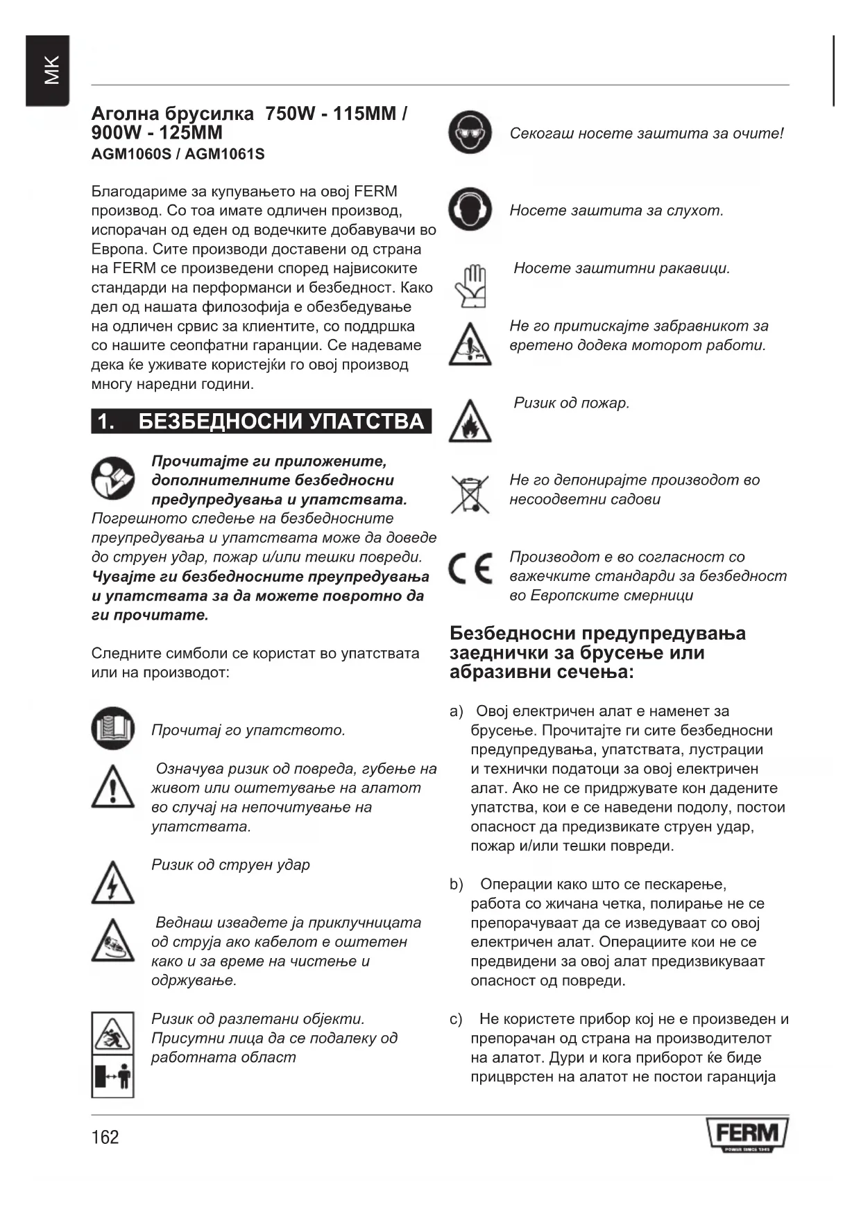Ризик од разлетани објекти. Присутни лица да се подалеку од работната област Секогаш носете заштита за очите! Носете заштита за слухот. Носете заштитни ракавици. Не го притискајте забравникот за вретено додека моторот работи. Ризик од пожар. Не го депонирајте производот во несоодветни садови Производот е во согласност со важечките стандарди за безбедност во Европските смерници Безбедносни предупредувања заеднички за брусење или абразивни сечења: a( Овој електричен алат е наменет за брусење. Прочитајте ги сите безбедносни предупредувања, упатствата, лустрации и технички податоци за овој електричен алат. Ако не се придржувате кон дадените упатства, кои е се наведени подолу, постои опасност да предизвикате струен удар, пожар и/или тешки повреди. b( Операции како што се пескарење, работа со жичана четка, полирање не се препорачуваат да се изведуваат со овој електричен алат. Операциите кои не се предвидени за овој алат предизвикуваат опасност од повреди. c( Не користете прибор кој не е произведен и препорачан од страна на производителот на алатот. Дури и кога приборот ќе биде прицврстен на алатот не постои гаранција163