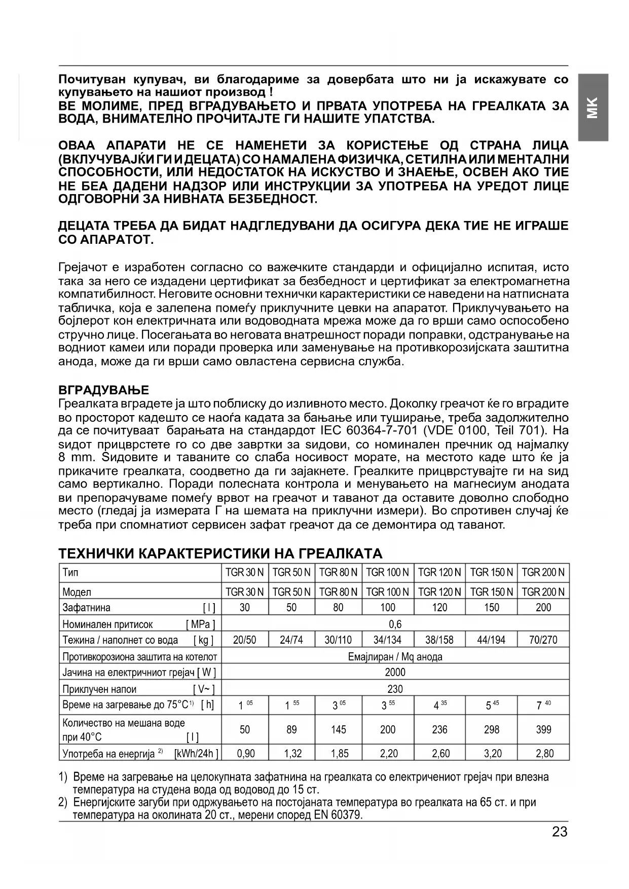 Почитуван купувач, ви благодариме за довербата што ни ја искажувате со купувањето на нашиот производ ! ВЕ МОЛИМЕ, ПРЕД ВГРАДУВАЊЕТО И ПРВАТА УПОТРЕБА НА ГРЕАЛКАТА ЗА ВОДА, ВНИМАТЕЛНО ПРОЧИТАЈТЕ ГИ НАШИТЕ УПАТСТВА. ОВАА АПАРАТИ НЕ СЕ НАМЕНЕТИ ЗА КОРИСТЕЊЕ ОД СТРАНА ЛИЦА (ВКЛУЧУВАЈЌИ ГИ И ДЕЦАТА) СО НАМАЛЕНА ФИЗИЧКА, СЕТИЛНА ИЛИ