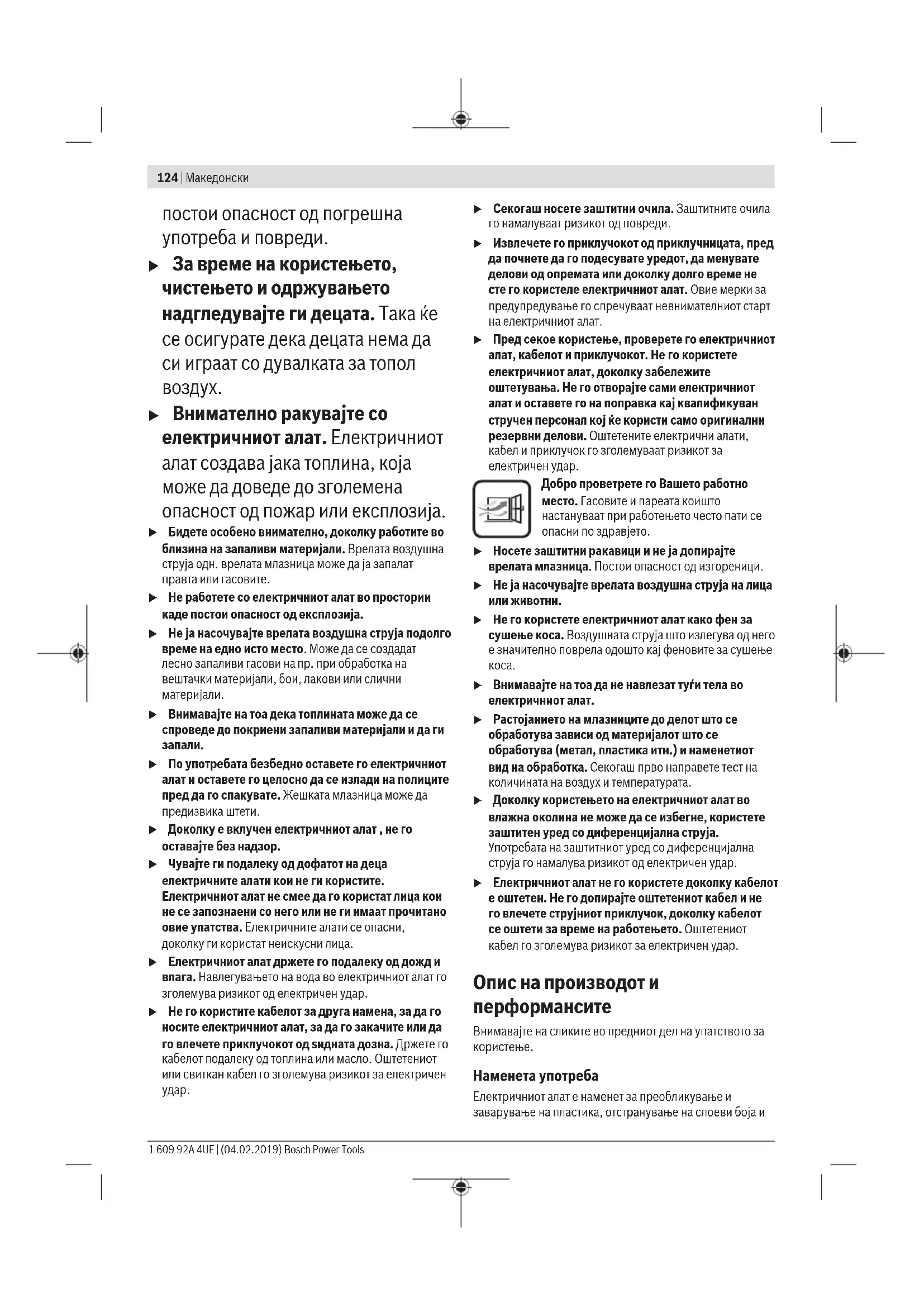 Чувајте ги безбедносните напомени и упатства за користење и за во иднина. u Оваа дувалка за топол воздух не е предвидена за употреба од деца и лица со ограничени физички, сензорни или ментални способности или со недоволно искуство и знаење. Оваа дувалка за топол воздух може да ја користат деца над 8 години како и лица со ограничени физички, сензорни и ментални способности или со недоволно искуство и знаење, доколку се под надзор од лица одговорни за нивната безбедност или се подучени за безбедно ракување со дувалката за топол воздух и ги разбираат опасностите кои може да произлезат од тоа. Инаку Bosch Power Tools 1 609 92A 4UE | (04.02.2019)124 | Македонски постои опасност од погрешна употреба и повреди. u За време на користењето, чистењето и одржувањето надгледувајте ги децата. Така ќе се осигурате дека децата нема да си играат со дувалката за топол