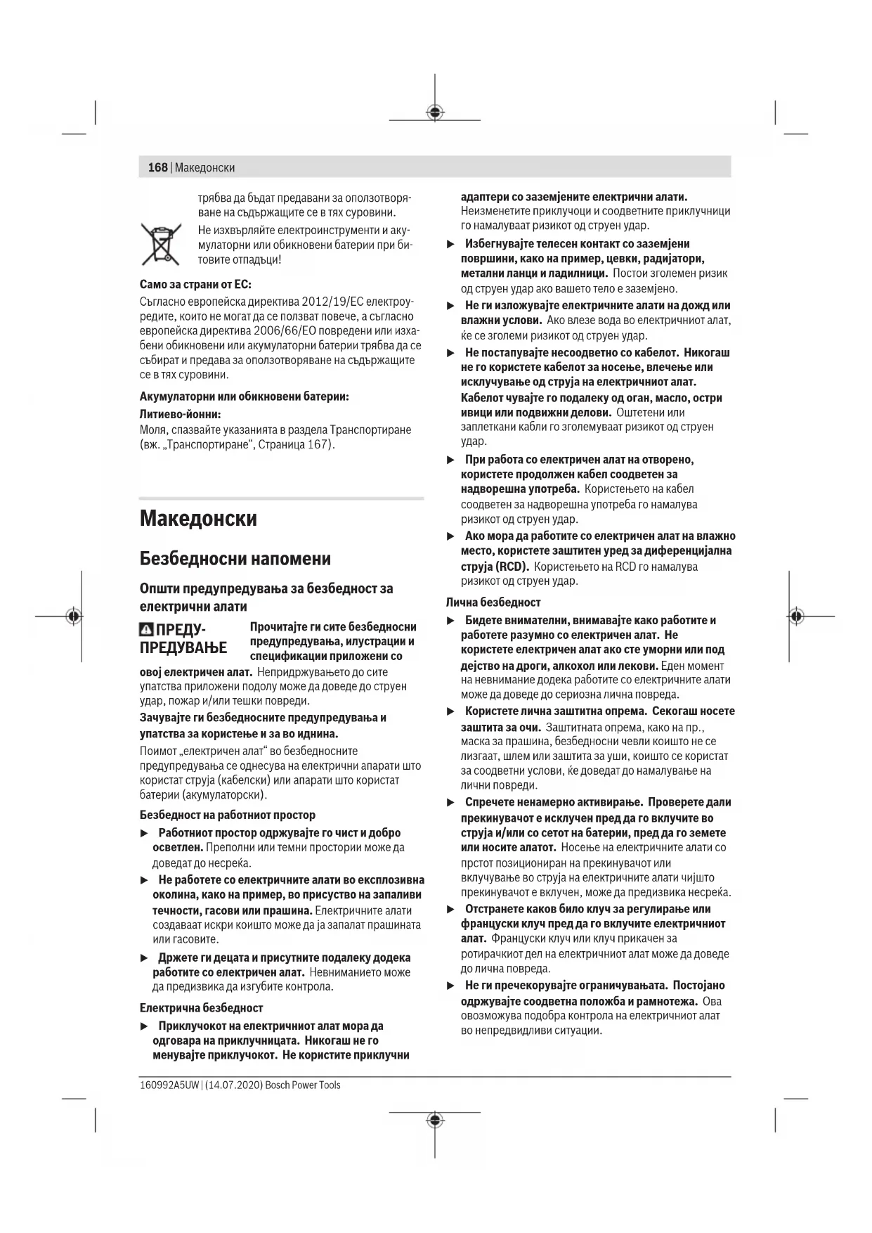 u При работа со електричен алат на отворено, користете продолжен кабел соодветен за надворешна употреба. Користењето на кабел соодветен за надворешна употреба го намалува ризикот од струен удар. u Ако мора да работите со електричен алат на влажно место, користете заштитен уред за диференцијална струја (RCD). Користењето на RCD го намалува ризикот од струен удар. Лична безбедност u Бидете внимателни, внимавајте како работите и работете разумно со електричен алат. Не користете електричен алат ако сте уморни или под дејство на дроги, алкохол или лекови. Еден момент на невнимание додека работите со електричните алати може да доведе до сериозна лична повреда. u Користете лична заштитна опрема. Секогаш носете заштита за очи. Заштитната опрема, како на пр., маска за прашина, безбедносни чевли коишто не се лизгаат, шлем или заштита за уши, коишто се користат за соодветни услови, ќе доведат до намалување на лични повреди. u Спречете ненамерно активирање. Проверете дали прекинувачот е исклучен пред да го вклучите во струја и/или со сетот на батерии, пред да го земете или носите алатот. Носење на електричните алати со прстот позициониран на прекинувачот или вклучување во струја на електричните алати чијшто прекинувачот е вклучен, може да предизвика несреќа. u Отстранете каков било клуч за регулирање или француски клуч пред да го вклучите електричниот алат. Француски клуч или клуч прикачен за ротирачкиот дел на електричниот алат може да доведе до лична повреда. u Не ги пречекорувајте ограничувањата. Постојано одржувајте соодветна положба и рамнотежа. Ова овозможува подобра контрола на електричниот алат во непредвидливи ситуации. 160992A5UW | (14.07.2020) Bosch Power ToolsМакедонски | 169 u Облечете се соодветно. Не носете широка облека и накит. Косата и алиштата треба да бидат подалеку од подвижните делови. Широката облека, накитот или долгата коса може да се закачат за подвижните