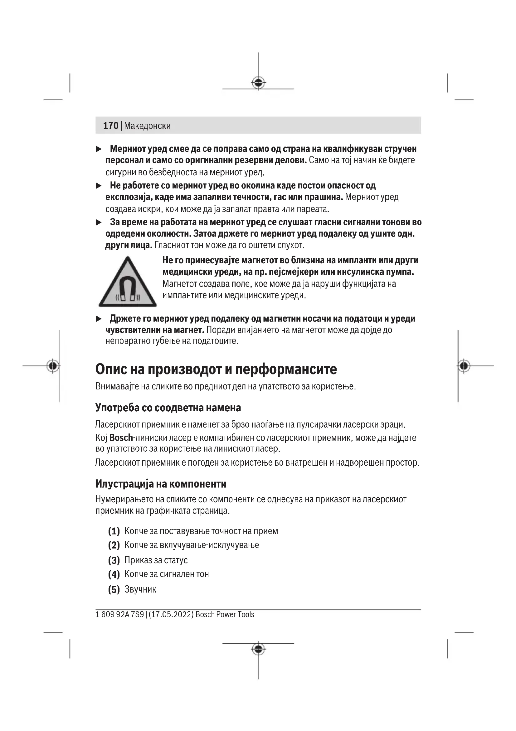 Безбедносни напомени Сите упатства треба да се прочитаат и да се внимава на нив. Доколку мерниот уред не се користи согласно приложените инструкции, може да се наруши функцијата на вградените заштитни механизми во мерниот уред. ДОБРО ЧУВАЈТЕ ГИ ОВИЕ УПАТСТВА. Bosch Power Tools 1 609 92A 7S9 | (17.05.2022)170 | Македонски u Мерниот уред смее да се поправа само од страна на квалификуван стручен персонал и само со оригинални резервни делови. Само на тој начин ќе бидете сигурни во безбедноста на мерниот уред. u Не работете со мерниот уред во околина каде постои опасност од експлозија, каде има запаливи течности, гас или прашина. Мерниот уред создава искри, кои може да ја запалат правта или пареата. u За време на работата на мерниот уред се слушаат гласни сигнални тонови во одредени околности. Затоа држете го мерниот уред подалеку од ушите одн. други лица. Гласниот тон може да го оштети слухот. Не го принесувајте магнетот во близина на импланти или други медицински уреди, на пр. пејсмејкери или инсулинска пумпа. Магнетотсоздава поле, кое може да ја наруши функцијата на имплантите или медицинските уреди. u Држете го мерниот уред подалеку од магнетни носачи на податоци и уреди чувствителни на магнет. Поради влијанието на магнетот може да дојде до неповратно губење на податоците. Опис на производот и перформансите Внимавајте на сликите во предниот дел на упатството за користење. Употреба со соодветна намена Ласерскиот приемник е наменет за брзо наоѓање на пулсирачки ласерски зраци. КојBosch-линиски ласер е компатибилен со ласерскиот приемник, може да најдете во упатството за користење на линискиот ласер. Ласерскиот приемник е погоден за користење во внатрешен и надворешен простор. Илустрација на компоненти Нумерирањето на сликите со компоненти се однесува на приказот на ласерскиот приемник на графичката страница. (1) Копче за поставување точност на прием (2) Копче за вклучување-исклучување (3) Приказ за статус (4) Копче за сигнален тон (5)