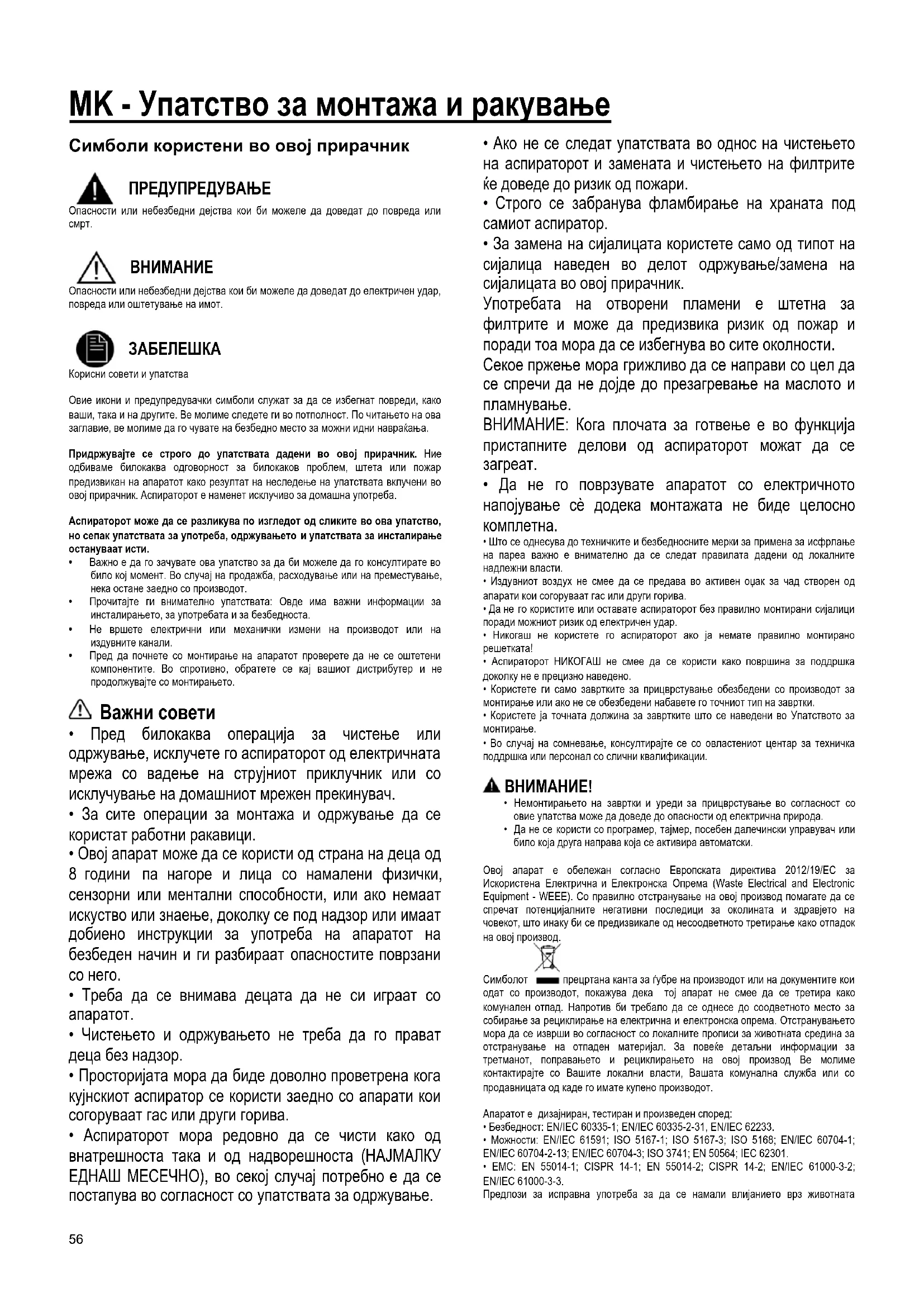 Корисни совети и упатства Овие икони и предупредувачки симболи служат за да се избегнат повреди, како ваши, така и на другите. Ве молиме следете ги во потполност. По читањето на ова заглавие, ве молиме да го чувате на безбедно место за можни идни навраќања. Придржувајте се строго до упатствата дадени во овој прирачник. Ние одбиваме билокаква одговорност за билокаков проблем, штета или пожар предизвикан на апаратот како резултат на неследење на упатствата вклучени во овој прирачник. Аспираторот е наменет исклучиво за домашна употреба. Аспираторот може да се разликува по изгледот од сликите во ова упатство, но сепак упатствата за употреба, одржувањето и упатствата за инсталирање остануваат исти.