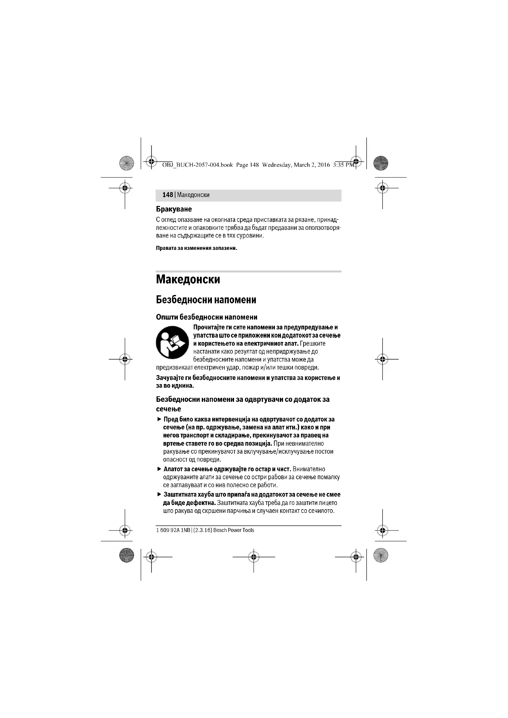 Пред било каква интервенција на одвртувачот со додаток за сечење (на пр. одржување, замена на алат итн.) како и при негов транспорт и складирање, прекинувачот за правец на вртење ставете го во средна позиција. При невнимателно ракување со прекинувачот за вклучување/исклучување постои опасност од повреди. Алатот за сечење одржувајте го остар и чист. Внимателно одржуваните алати за сечење со остри рабови за сечење помалку се заглавуваат и со нив полесно се работи. Заштитната хауба што припаѓа на додатокот за сечење не смее да биде дефектна. Заштитната хауба треба да го заштити лицето што ракува од скршени парчиња и случаен контакт со сечилото. OBJ_BUCH-2057-004.book Page 148 Wednesday, March 2, 2016 3:35 PMМакедонски | 149 Bosch Power Tools 1 609 92A 1NB | (2.3.16) Не обработувајте материјал што содржи азбест. Азбестот важи како канцероген. При сечењето внимавајте на каблите што спроведуваат напон. Постои опасност од електричен удар. При сечењето, никогаш не ја ставајте дланката пред сечилото. Постои опасност од повреда. Избегнувајте случајно вклучување. Доколку го носите електричниот апарат со прстот на прекинувачот за вклучување/исклучување, може предизвикате несреќа. Не ги оставајте децата без надзор. Така ќе се осигурате дека децата нема да си играат додатокот за сечење или со одвртувачот со монтиран додаток за сечење. Овој одвртувач со додаток за сечење не е предвиден за користење од страна на деца и лица со намалени психички, физички или душевни способности или недоволно искуство и