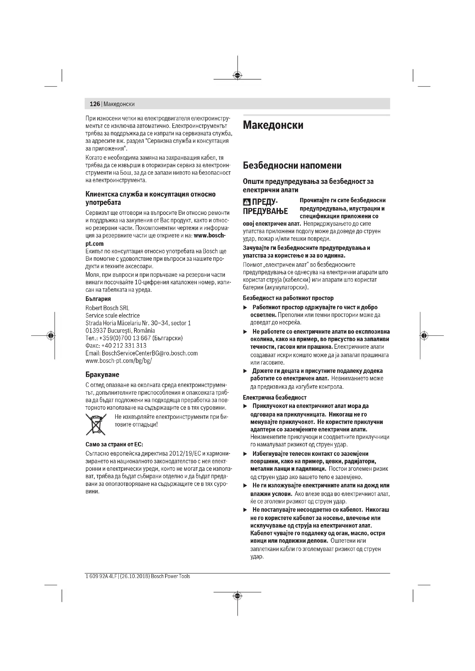 Сервисирање u Електричниот алат сервисирајте го кај квалификувано лице кое користи само идентични резервни делови. Со ова се овозможува безбедно одржување на електричниот алат. Безбедносни напомени за рендиња u Почекајте сечилото да престане да работи пред да го спуштите алатот. Изложеното ротирачко сечило може да ја зафати долната површина, и со тоа да изгуби контрола и да предизвика сериозни повреди. u Држете го електричниот алат за изолираната површина, бидејќи сечилото може да дојде во контакт со својот кабел. Сечењето на жица „под Македонски | 127 Bosch Power Tools 1 609 92A 4LF | (26.10.2018)128 | Македонски 1 609 92A 4LF | (26.10.2018) Bosch Power Tools напон“ може да ги изложи металните делови на електричниот алат „под напон“ и операторот може да добие струен удар. u Користете менгеме или некој друг практичен начин за да го обезбедите и прицврстите делот што се обработува на стабилна површина. Доколку го држите делот што се обработува со рака или го наслоните на вас, тоа ќе биде нестабилно и може да изгубите контрола. u Ставете го електричниот алат само кога е вклучен на делот што се обработува. Инаку постои опасност од повратен удар, доколку алатот што се вметнува се заглави во делот што се обработува. u Не ги фаќајте исфрлените струготини со раце. Може да се повредите од ротирачките делови. u Не рендајте никогаш над метални предмети, клинци и завртки. Секачот и вратилото на секачот може да се оштетат и да ги зголемат вибрациите. u Користете соодветни уреди за пребарување, за да ги пронајдете скриените електрични кабли или консултирајте се со локалното претпријатие за снабдување со електрична енергија. Контактот со електрични кабли може да доведе до пожар и струен удар. Оштетувањето на гасоводот може да доведе до експлозија. Навлегувањето во водоводни цевки предизвикува оштетување и може да предизвика електричен удар. u При работата рендето држете го секогаш на начин што подлогата на рендето секогаш ќе лежи на делот што се обработува. Инаку работата со рендето може да се навали и да доведе до повреди. u При работата, држете го електричниот алат цврсто со двете дланки и застанете во сигурна положба. Со електричниот алат посигурно ќе управувате ако го држите со двете дланки. Опис на производот и перформансите Прочитајте ги сите безбедносни напомени и упатства. Грешките настанати како резултат од непридржување до безбедносните напомени и упатства може да предизвикаат електричен удар, пожар и/или тешки повреди. Внимавајте на сликите во предниот дел на упатството за