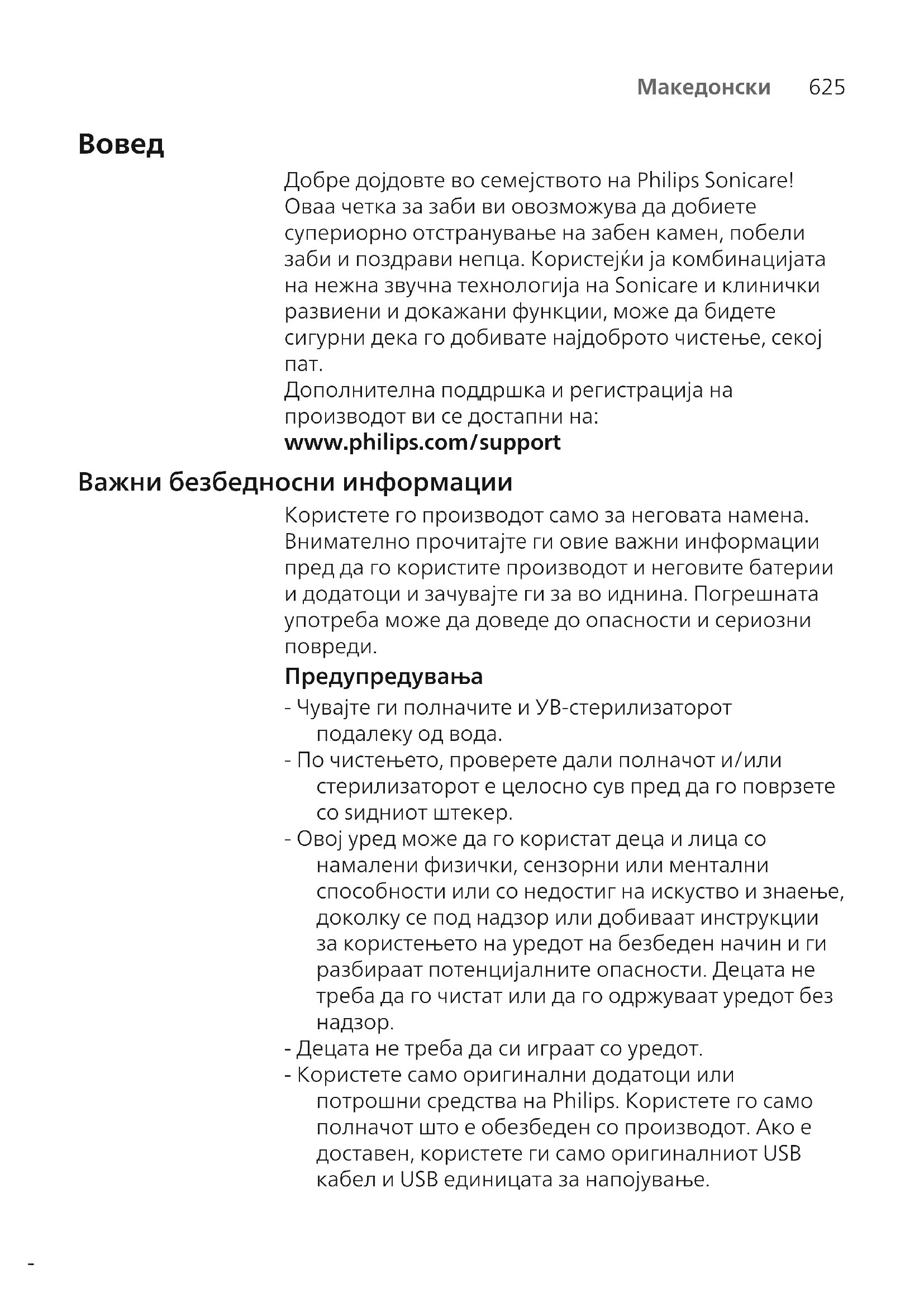 - Уредов е уред за лична нега и не е наменет за користење на повеќе пациенти во стоматолошка ординација или институција. Безбедносни упатства за батеријата - Овој уред содржи батерии на полнење што смеат да ги отстрануваат само обучени лица - Користете го производот само за неговата намена. Внимателно прочитајте ги овие информации пред да ги користите производот и неговите батерии и додатоци и зачувајте ги за во иднина. Погрешната употреба може да доведе до опасности и сериозни повреди. Доставените додатоци може да се разликуваат за различни производи. - Користете само оригинални додатоци и потрошни средства на Philips. Користете ја само единицата за напојување што се вади TCBxxxx, HX6100, HX6110, HX6160 или WAAxxxx. - Чувајте ги производот и батериите подалеку од оган и немојте да ги изложувате на директна сончева светлина или високи температури. - Ако производот се загрее премногу или почне да мириса, ја промени бојата или ако полнењето трае подолго од вообичаено, престанете со користењето и полнењето на производот и контактирајте со Philips. - Не ставајте ги производите и нивните батерии во микробранови печки или на индукциски шпорети. - Немојте да го отворате, изменувате, продупчувате, оштетувате или расклопувате производот или батеријата за да спречите батериите да се загреваат или да испуштаат токсични или опасни супстанции. Немојте да правите краток спој, премногу да ги наполнувате или обратно да ги полните батериите.628