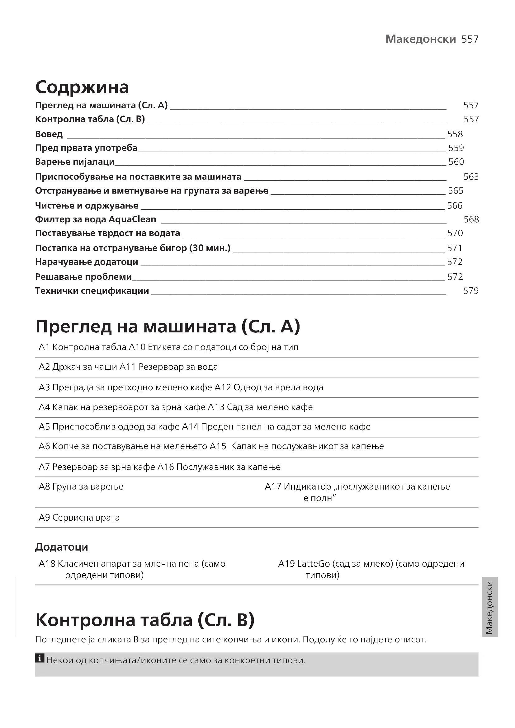 Преглед на машината (Сл. А) ____________________________________________________________ 557 Контролна табла (Сл. B) _________________________________________________________________ 557 Вовед __________________________________________________________________________________ 558Пред првата употреба___________________________________________________________________ 559Варење пијалаци________________________________________________________________________ 560 Приспособување на поставките за машината ____________________________________________ 563 Отстранување и вметнување на групата за варење ______________________________________ 565Чистење и одржување __________________________________________________________________ 566 Филтер за вода AquaClean ______________________________________________________________ 568 Поставување тврдост на водата _________________________________________________________ 570Постапка на отстранување бигор (30 мин.) ______________________________________________ 571Нарачување додатоци __________________________________________________________________ 572Решавање проблеми____________________________________________________________________ 572 Технички спецификации ________________________________________________________________ 579 Преглед на машината (Сл. А) A1 Контролна табла A10 Етикета со податоци со број на типA2 Држач за чаши A11 Резервоар за водаA3 Преграда за претходно мелено кафе A12 Одвод за врела водаA4 Капак на резервоарот за зрна кафе A13 Сад за мелено кафеA5 Приспособлив одвод за кафе A14 Преден панел на садот за мелено кафеA6 Копче за поставување на мелењето A15 Капак на послужавникот за капењеA7 Резервоар за зрна кафе A16 Послужавник за капењеA8 Група за варење A17 Индикатор „послужавникот за капењее полн“A9 Сервисна врата A18 Класичен апарат за млечна пена (самоодредени типови)A19 LatteGo (сад за млеко) (само одреденитипови) Контролна табла (Сл. B) Погледнете ја сликата B за преглед на сите копчиња и икони. Подолу ќе го најдете описот. Некои од копчињата/иконите се само за конкретни типови.558