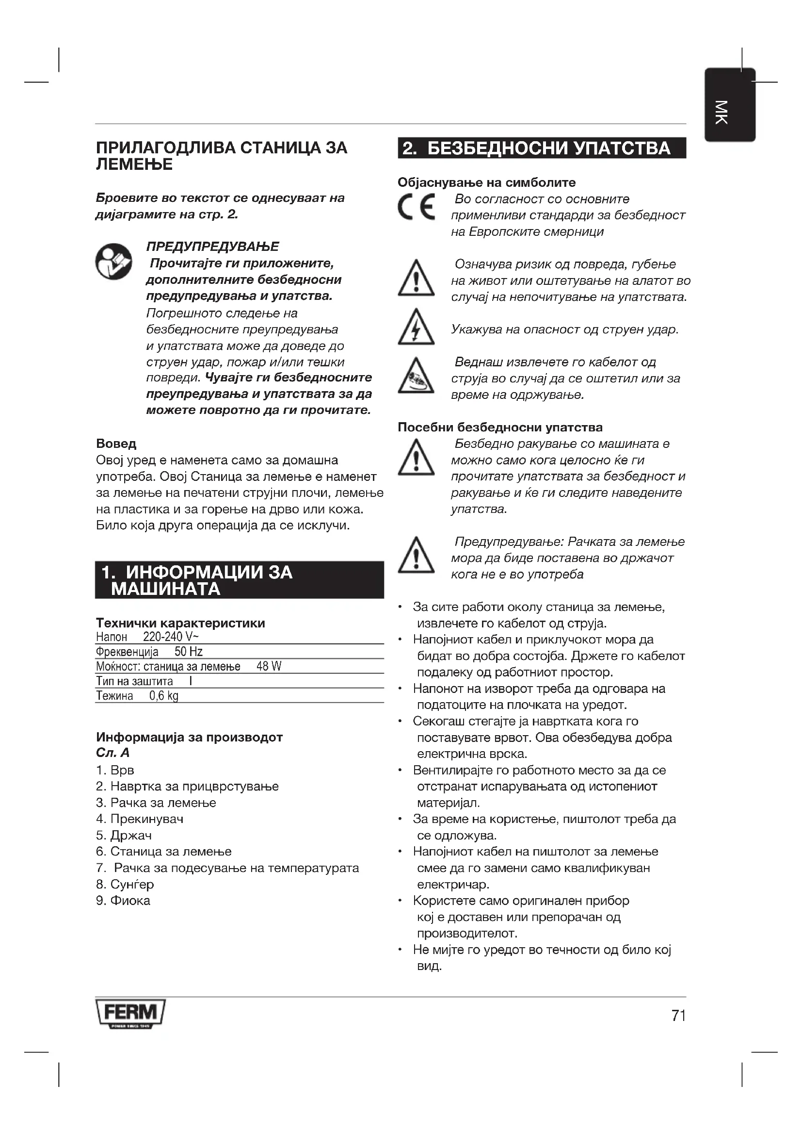 - Чад или смрдеа од изгорена изолација. За време на првото користење на рачката за лемење може да се создаде чад, ова е маст што се користи при изгорување во производството. Електрична безбедност При користење на електрични машини почитувајте ги безбедносните правила во вашата земја, за да го намалите ризикот од пожар, струен удар и повреди. Прочитајте ги следните безбедносни упатства и приложените безбедносни упатства. Секогашпроверувајтедалинапонот нанапојувањетоодговарана наведениотнапоннаплочката. Мрежно приклучување Користете само заземјени приклучоци со заземјена жица во согласност со прописите. Замена на кабли или приклучници Веднаш да ги фрлите старите кабли или приклучници, кога ќе ги замените со нови. Опасно е да ја вклучите приклучницата ако кабелот е лабав. Користете продолжни кабли Користете само одобрени продолжни кабли погодни за влезната моќност на машината. Најмал попречен пресек е 1,5 mm2. Кога се користи кабел во ролна, секогаш целосно да го одмотате. Продолжните кабли секогаш да бидат заземјени.