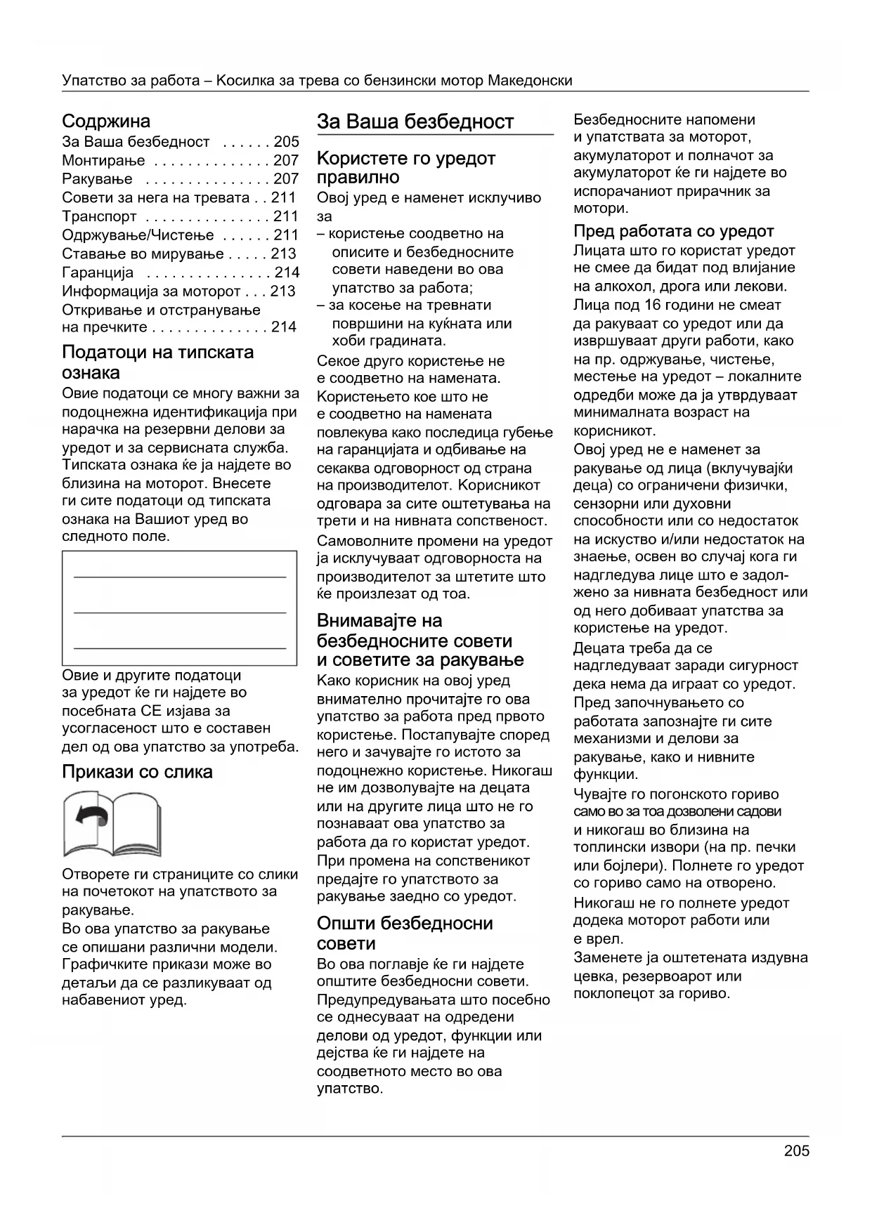 Hикогаш не го користете уредот со оштетени или без поставени безбедносни механизми. Безбедносен лак (1) Безбедносниот лак служи за Ваша безбедност за веднаш да го запрете моторот и резниот механизам при итен случаj. Hе смее да се врши обид за заобиколување на неговата функциjа. Поклопец за исфрлување (2) или заштита од удар (3) Поклопецот за исфрлување/заштитата од удар Ве штити од повреди од резниот механизам или од излетаните цврсти предмети. Уредот смее да се користи само со поклопец за исфрлување или со заштита од удар. Знаци на уредот Hа уредот се наоѓаат различни знаци како налепници. Во следниот дел се поjаснети знаците:Внимание! Пред пуштањето во работа прочитајте го упатството за ракување!Трети лица нека стојат понастрана од опасното подрачје!Исклучете го моторот и извлечете го клучот за палење пред секое работење врз уредот и пред да го напуштите уредот.Внимаваjте на дополнителните совети во поглавjето «За Ваша безбедност».Пред работењето на резните алати извлечете го приклучокот за свеќичката за палење! Држете ги прстите и стопалата подалеку од резните алати! Пред дотерувањето или чистењето на уредот или пред проверката исклучете го уредот и извлечете го приклучокот за свеќичката за палење.