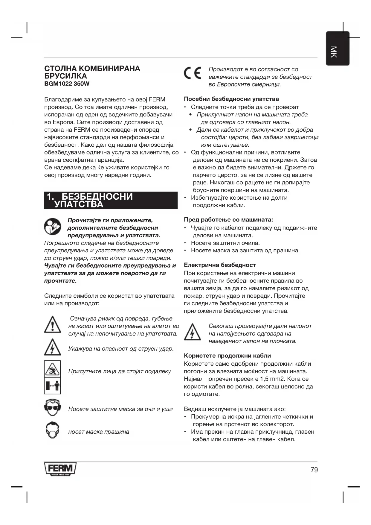 Следните симболи се користат во упатствата или на производот: Означува ризик од повреда, губење на живот или оштетување на алатот во случај на непочитување на упатствата. Укажува на опасност од струен удар. Присутните лица да стојат подалеку Носете заштитна маска за очи и уши носат маска прашина Производот е во согласност со важечките стандарди за безбедност во Европските смерници. Посебни безбедносни упатства
