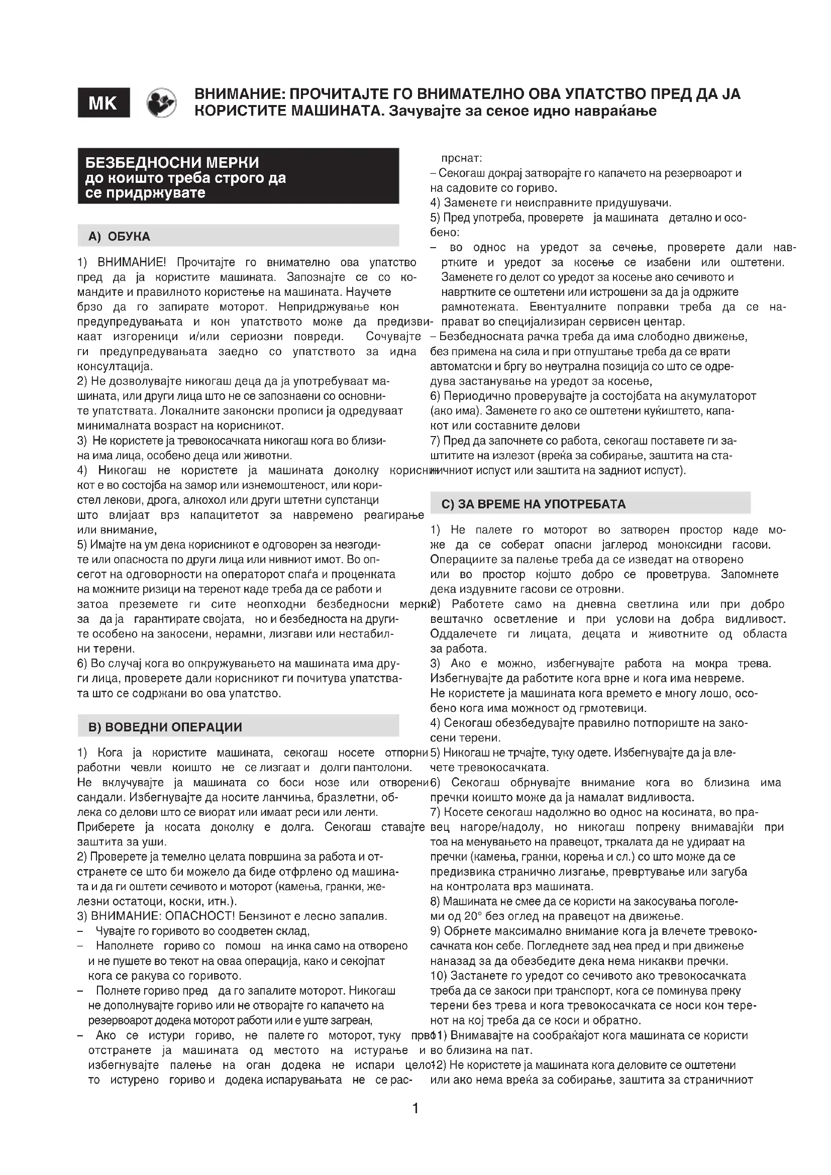 3) Ако е можно, избегнувајте работа на мокра трева. Избегнувајте да работите кога врне и кога има невреме. Не користете ја машината кога времето е многу лошо, осо- бено кога има можност од грмотевици. 4) Секогаш обезбедувајте правилно потпориште на зако- сени терени. 5) Никогаш не трчајте, туку одете. Избегнувајте да ја вле- чете тревокосачката. 6) Секогаш обрнувајте внимание кога во близина има пречки коишто може да ја намалат видливоста. 7) Косете секогаш надолжно во однос на косината, во пра- вец нагоре/надолу, но никогаш попреку внимавајќи при тоа на менувањето на правецот, тркалата да не удираат на пречки (камења, гранки, корења и сл.) со што може да се предизвика странично лизгање, превртување или загуба на контролата врз машината. 8) Машината не смее да се користи на закосувања поголе- ми од 20° без оглед на правецот на движење. 9) Обрнете максимално внимание кога ја влечете тревоко- сачката кон себе. Погледнете зад неа пред и при движење наназад за да обезбедите дека нема никакви пречки. 10) Застанете го уредот со сечивото ако тревокосачката треба да се закоси при транспорт, кога се поминува преку терени без трева и кога тревокосачката се носи кон тере- нот на кој треба да се коси и обратно. 11) Внимавајте на сообраќајот кога машината се користи во близина на пат. 12) Не користете ја машината кога деловите се оштетени или ако нема вреќа за собирање, заштита за страничниот2 испуст или заштита за задниот испуст. 13) Обрнете особено внимание во присуство на стрмнини, дупки или препреки. 14) Внимателно вклучете го моторот според упатството и држете ги нозете подалеку од уредот со сечивото. 15) Не закосувајте ја тревокосачката во движење. Вклучувајте ја на рамни површини, исчистени од препре- ки и висока трева. 16) Не приближувајте ги рацете или нозете до или под де- ловите што ротираат. Секогаш стојте оддалечено од отво- рот за празнење. 17) Не подигнувајте ја или не транспортирајте ја тревоко- сачката кога работи моторот. 18) Не преправајте или дезактивирајте ги безбедносни- те системи. 19) Не менувајте ги регулациите на моторот и не користе- те го при режим со превисоки вртежи. 20) Не допирајте ги компонентите на моторот коишто се загреале во текот на работата. Ризик од опекотини. 21) Кај моделите на погон, исклучете ја спојницата за пре- нос на тркалата пред да го вклучите моторот. 22) Секогаш користете дополнителна опрема одобрена од производителот на машината. 23) Не користете ја машината ако дополнителната/помош- ната опрема не се поставени на дадените точки. 24) Исклучете го уредот со сечивото, застанете го мото- рот и извадете го кабелот за свеќичката (внимавајќи при тоа сите делови во движење да бидат застанати докрај): – при транспорт на машината, – секојпат кога машината ја оставате без надзор; Извадете го клучот кај моделите со електрично палење; – пред да ги отстранувате причините за блокирање или чистење на испусниот канал, – пред проверка, чистење или работа врз машината, – по удар во страни предмети. Проверете дали има евен- туални оштетувања на машината и направете ги неоп- ходните поправки пред да одново да ја користите. 25) Исклучете го уредот со сечивото и застанете го мо-