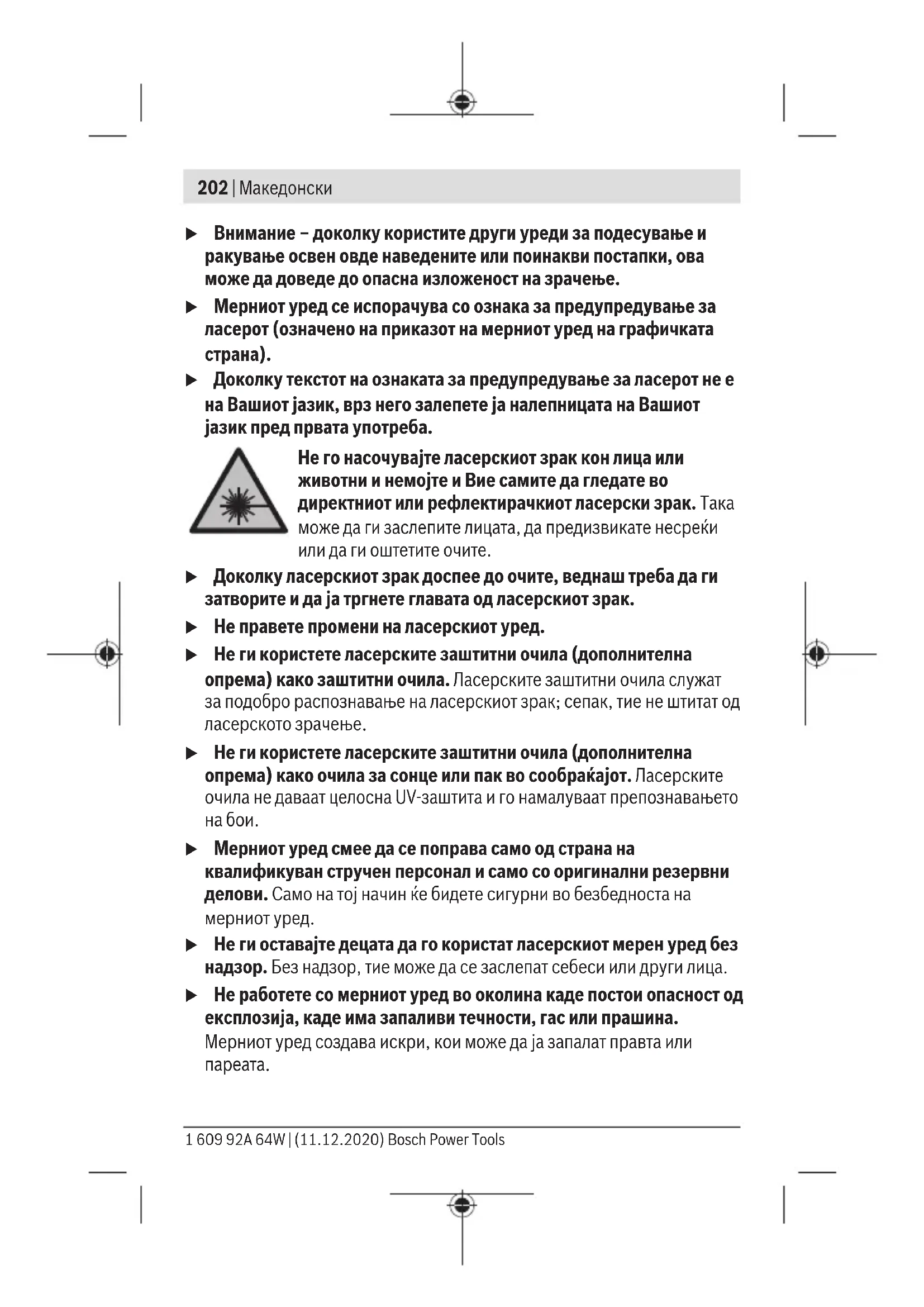 Безбедносни напомени Сите упатства треба да се прочитаат и да се внимава на нив, за да може безбедно и без опасност да работите со мерниот уред. Доколку мерниот уред не се користи согласно приложените инструкции, може да се наруши функцијата на вградените заштитни механизми во мерниот уред. Не ги оштетувајте налепниците за предупредување. ДОБРО ЧУВАЈТЕ ГИ ОВИЕ УПАТСТВА И ПРЕДАДЕТЕ ГИ ЗАЕДНО СО МЕРНИОТ УРЕД. Bosch Power Tools 1 609 92A 64W | (11.12.2020)202 | Македонски u Внимание – доколку користите други уреди за подесување и ракување освен овде наведените или поинакви постапки, ова може да доведе до опасна изложеност на зрачење. u Мерниот уред се испорачува со ознака за предупредување за ласерот (означено на приказот на мерниот уред на графичката