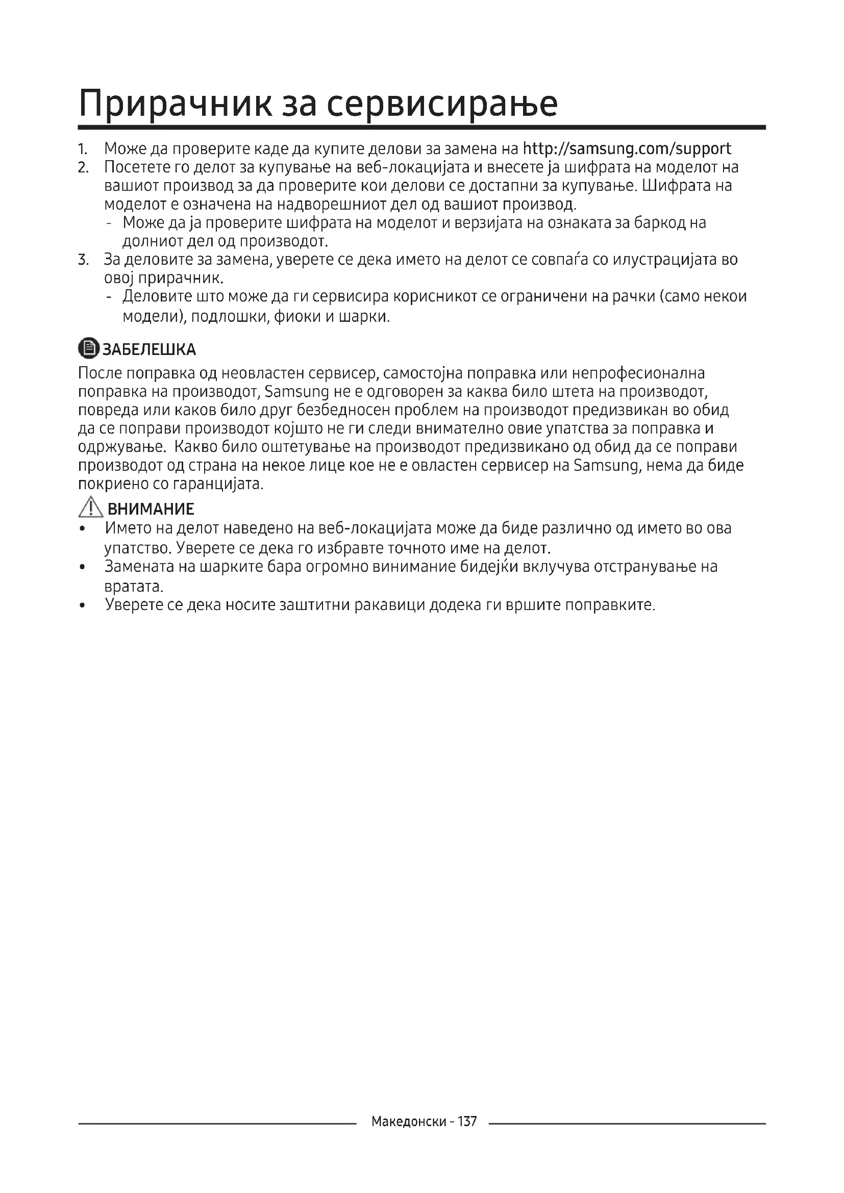 После поправка од неовластен сервисер, самостојна поправка или непрофесионална поправка на производот, Samsung не е одговорен за каква било штета на производот, повреда или каков било друг безбедносен проблем на производот предизвикан во обид да се поправи производот којшто не ги следи внимателно овие упатства за поправка и одржување. Какво било оштетување на производот предизвикано од обид да се поправи производот од страна на некое лице кое не е овластен сервисер на Samsung, нема да биде покриено со гаранцијата.