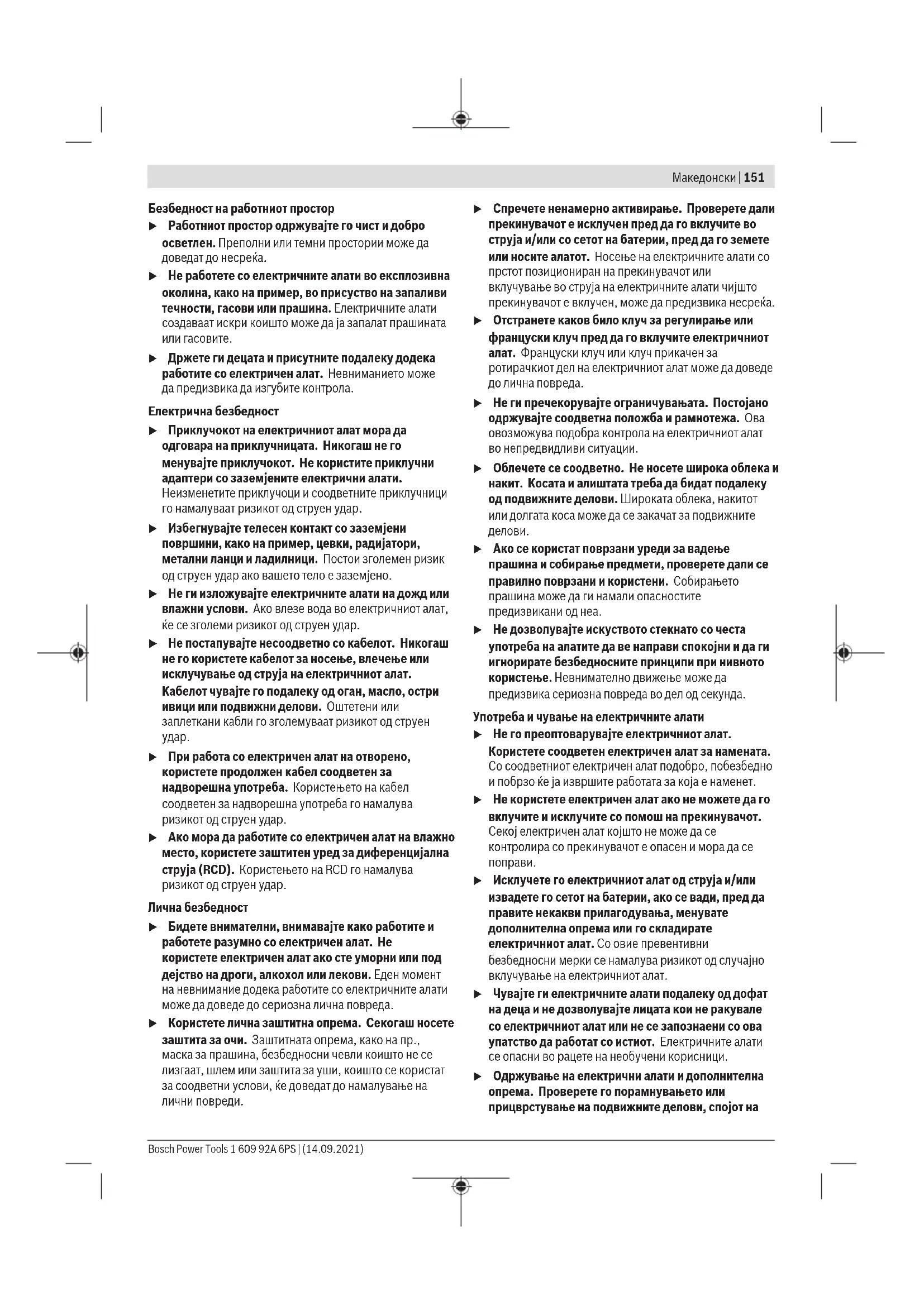 Прочитајте ги сите безбедносни предупредувања, илустрации и спецификации приложени со овој електричен алат. Непридржувањето до сите упатства приложени подолу може да доведе до струен удар, пожар и/или тешки повреди. Зачувајте ги безбедносните предупредувања и упатства за користење и за во иднина. Поимот „електричен алат“ во безбедносните предупредувања се однесува на електрични апарати што користат струја (кабелски) или апарати што користат батерии (акумулаторски). 1 609 92A 6PS | (14.09.2021) Bosch Power ToolsМакедонски | 151 Безбедност на работниот простор u Работниот простор одржувајте го чист и добро осветлен. Преполни или темни простории може да доведат до несреќа. u Не работете со електричните алати во експлозивна околина, како на пример, во присуство на запаливи течности, гасови или прашина. Електричните алати создаваат искри коишто може да ја запалат прашината или гасовите. u Држете ги децата и присутните подалеку додека работите со електричен алат. Невниманието може да предизвика да изгубите контрола. Електрична безбедност u Приклучокот на електричниот алат мора да одговара на приклучницата. Никогаш не го менувајте приклучокот. Не користите приклучни адаптери со заземјените електрични алати. Неизменетите приклучоци и соодветните приклучници го намалуваат ризикот од струен удар. u Избегнувајте телесен контакт со заземјени површини, како на пример, цевки, радијатори, метални ланци и ладилници. Постои зголемен ризик од струен удар ако вашето тело е заземјено. u Не ги изложувајте електричните алати на дожд или влажни услови. Ако влезе вода во електричниот алат, ќе се зголеми ризикот од струен удар. u Не постапувајте несоодветно со кабелот. Никогаш не го користете кабелот за носење, влечење или исклучување од струја на електричниот алат. Кабелот чувајте го подалеку од оган, масло, остри ивици или подвижни делови. Оштетени или заплеткани кабли го зголемуваат ризикот од струен