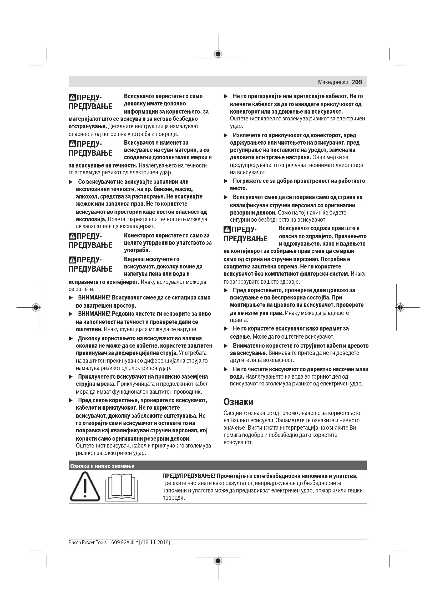 Следните ознаки се од големо значење за користењето на Вашиот всисувач. Запаметете ги ознаките и нивното значење. Вистинската интерпретација на ознаките Ви помага подобро и побезбедно да го користите всисувачот. Ознаки и нивно значење ПРЕДУПРЕДУВАЊЕ! Прочитајте ги сите безбедносни напомени и упатства. Грешките настанати како резултат од непридржување до безбедносните напомени и упатства може да предизвикаат електричен удар, пожар и/или тешки