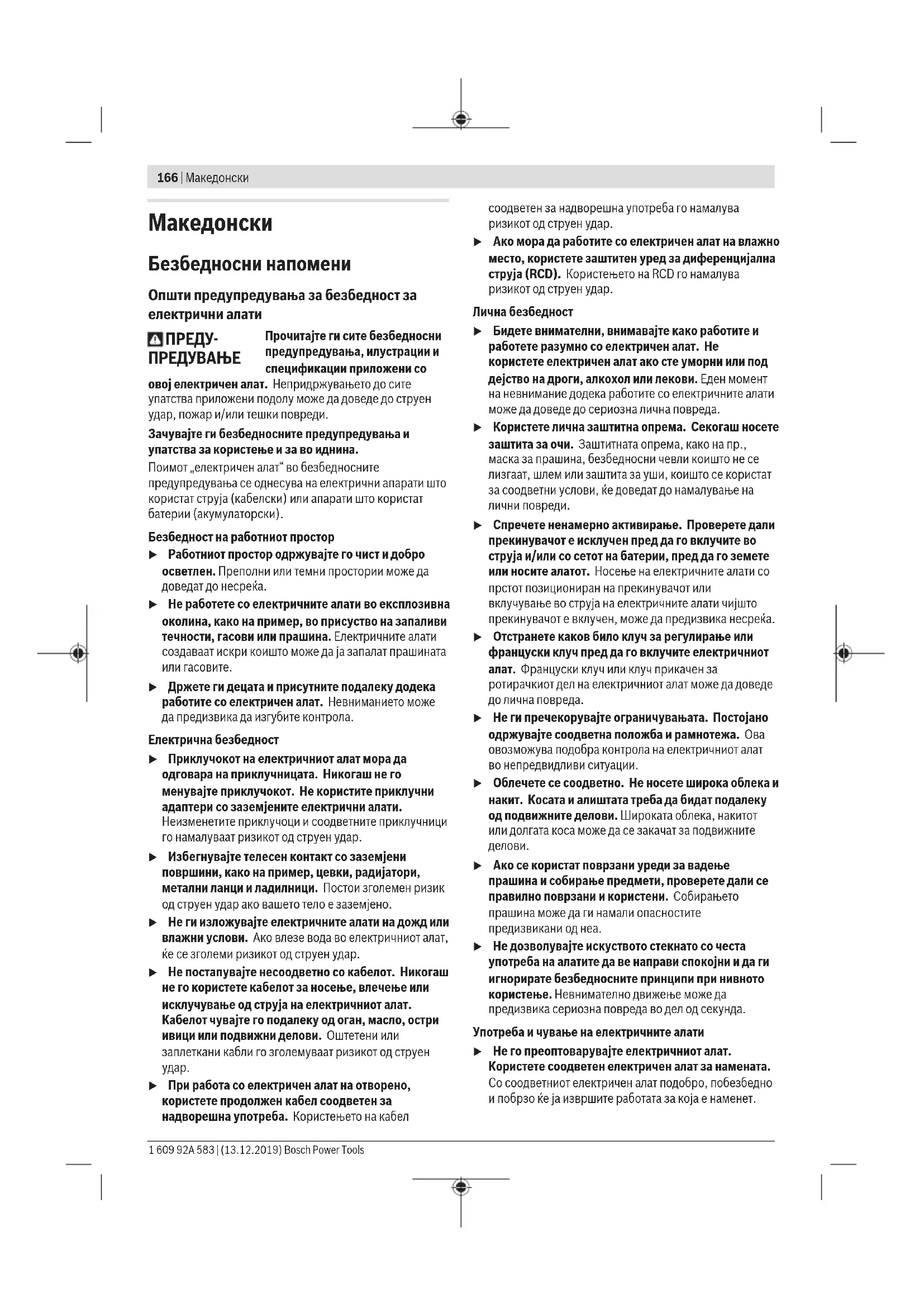 u Ако се користат поврзани уреди за вадење прашина и собирање предмети, проверете дали се правилно поврзани и користени. Собирањето прашина може да ги намали опасностите предизвикани од неа. u Не дозволувајте искуството стекнато со честа употреба на алатите да ве направи спокојни и да ги игнорирате безбедносните принципи при нивното користење. Невнимателно движење може да предизвика сериозна повреда во дел од секунда. Употреба и чување на електричните алати u Не го преоптоварувајте електричниот алат. Користете соодветен електричен алат за намената. Со соодветниот електричен алат подобро, побезбедно и побрзо ќе ја извршите работата за која е наменет. 1 609 92A 583 | (13.12.2019) Bosch Power ToolsМакедонски | 167 u Не користете електричен алат ако не можете да го вклучите и исклучите со помош на прекинувачот. Секој електричен алат којшто не може да се контролира со прекинувачот е опасен и мора да се