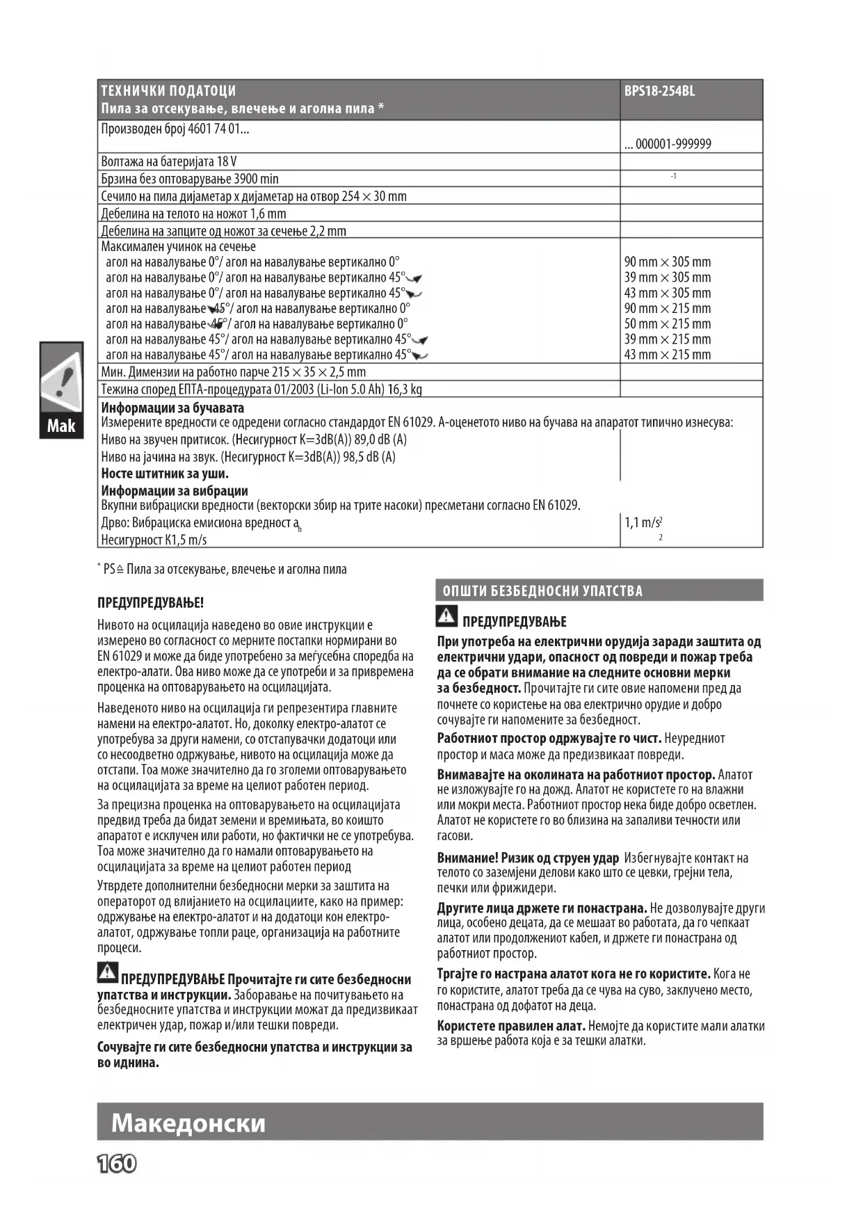 Сечило на пила дијаметар х дијаметар на отвор 254 × 30 mm Дебелина на телото на ножот 1,6 mm Дебелина на запците од ножот за сечење 2,2 mm Максимален учинок на сечење агол на навалување 0°/ агол на навалување вертикално 0° агол на навалување 0°/ агол на навалување вертикално 45° агол на навалување 0°/ агол на навалување вертикално 45° агол на навалување 45°/ агол на навалување вертикално 0° агол на навалување 45°/ агол на навалување вертикално 0° агол на навалување 45°/ агол на навалување вертикално 45° агол на навалување 45°/ агол на навалување вертикално 45° 90 mm × 305 mm 39 mm × 305 mm 43 mm × 305 mm 90 mm × 215 mm 50 mm × 215 mm 39 mm × 215 mm 43 mm × 215 mm Мин. Димензии на работно парче 215 × 35 × 2,5 mm Тежина според ЕПТА-процедурата 01/2003 (Li-Ion 5.0 Ah) 16,3 kg Информации за бучавата Измерените вредности се одредени согласно стандардот EN 61029. A-оценетото ниво на бучава на апаратот типично изнесува: Ниво на звучен притисок. (Несигурност K=3dB(A)) 89,0 dB (A) Ниво на јачина на звук. (Несигурност K=3dB(A)) 98,5 dB (A) Носте штитник за уши. Информации за вибрации Вкупни вибрациски вредности (векторски збир на трите насоки) пресметани согласно EN 61029. Дрво: Вибрациска емисиона вредност a