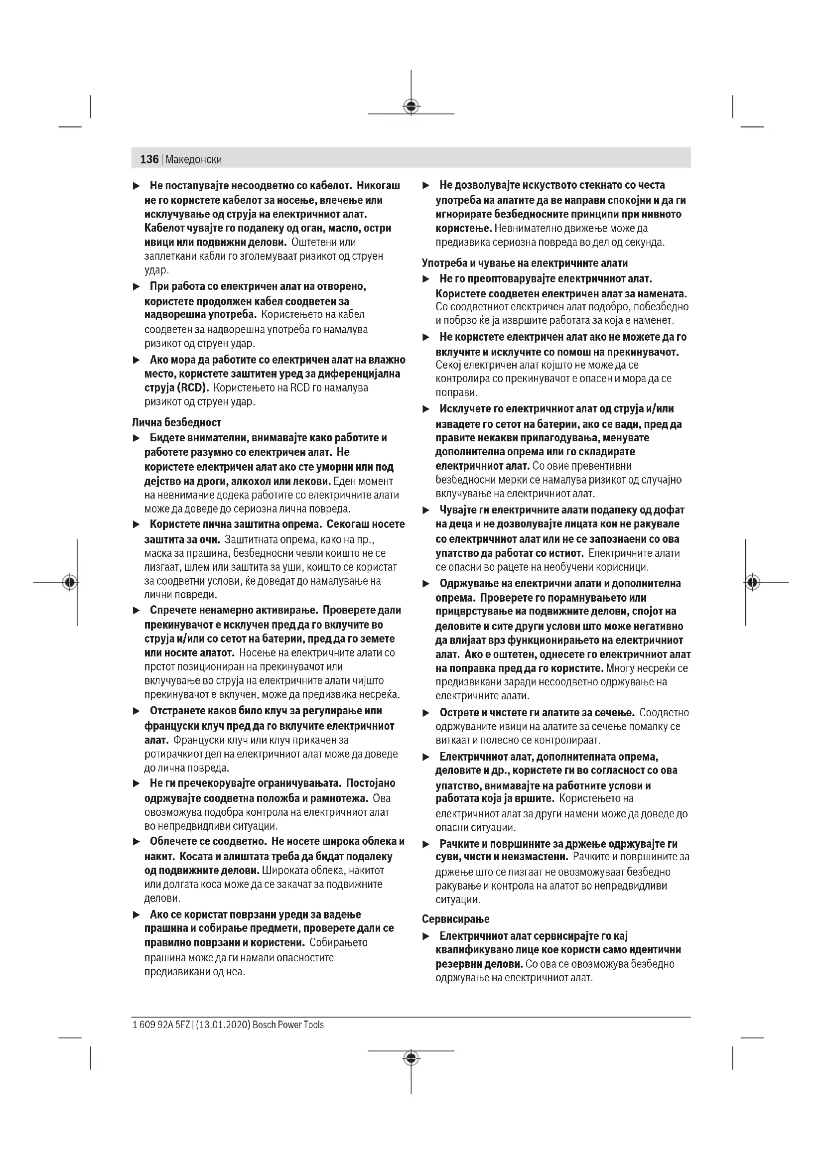 Прочитајте ги сите безбедносни предупредувања, илустрации и спецификации приложени со овој електричен алат. Непридржувањето до сите упатства приложени подолу може да доведе до струен удар, пожар и/или тешки повреди. Зачувајте ги безбедносните предупредувања и упатства за користење и за во иднина. Поимот „електричен алат“ во безбедносните предупредувања се однесува на електрични апарати што користат струја (кабелски) или апарати што користат батерии (акумулаторски). Безбедност на работниот простор u Работниот простор одржувајте го чист и добро осветлен. Преполни или темни простории може да доведат до несреќа. u Не работете со електричните алати во експлозивна околина, како на пример, во присуство на запаливи течности, гасови или прашина. Електричните алати создаваат искри коишто може да ја запалат прашината или гасовите. u Држете ги децата и присутните подалеку додека работите со електричен алат. Невниманието може да предизвика да изгубите контрола. Електрична безбедност u Приклучокот на електричниот алат мора да одговара на приклучницата. Никогаш не го менувајте приклучокот. Не користите приклучни адаптери со заземјените електрични алати. Неизменетите приклучоци и соодветните приклучници го намалуваат ризикот од струен удар. u Избегнувајте телесен контакт со заземјени површини, како на пример, цевки, радијатори, метални ланци и ладилници. Постои зголемен ризик од струен удар ако вашето тело е заземјено. u Не ги изложувајте електричните алати на дожд или влажни услови. Ако влезе вода во електричниот алат, ќе се зголеми ризикот од струен удар. Bosch Power Tools 1 609 92A 5FZ | (13.01.2020)136 | Македонски u Не постапувајте несоодветно со кабелот. Никогаш не го користете кабелот за носење, влечење или исклучување од струја на електричниот алат. Кабелот чувајте го подалеку од оган, масло, остри ивици или подвижни делови. Оштетени или заплеткани кабли го зголемуваат ризикот од струен