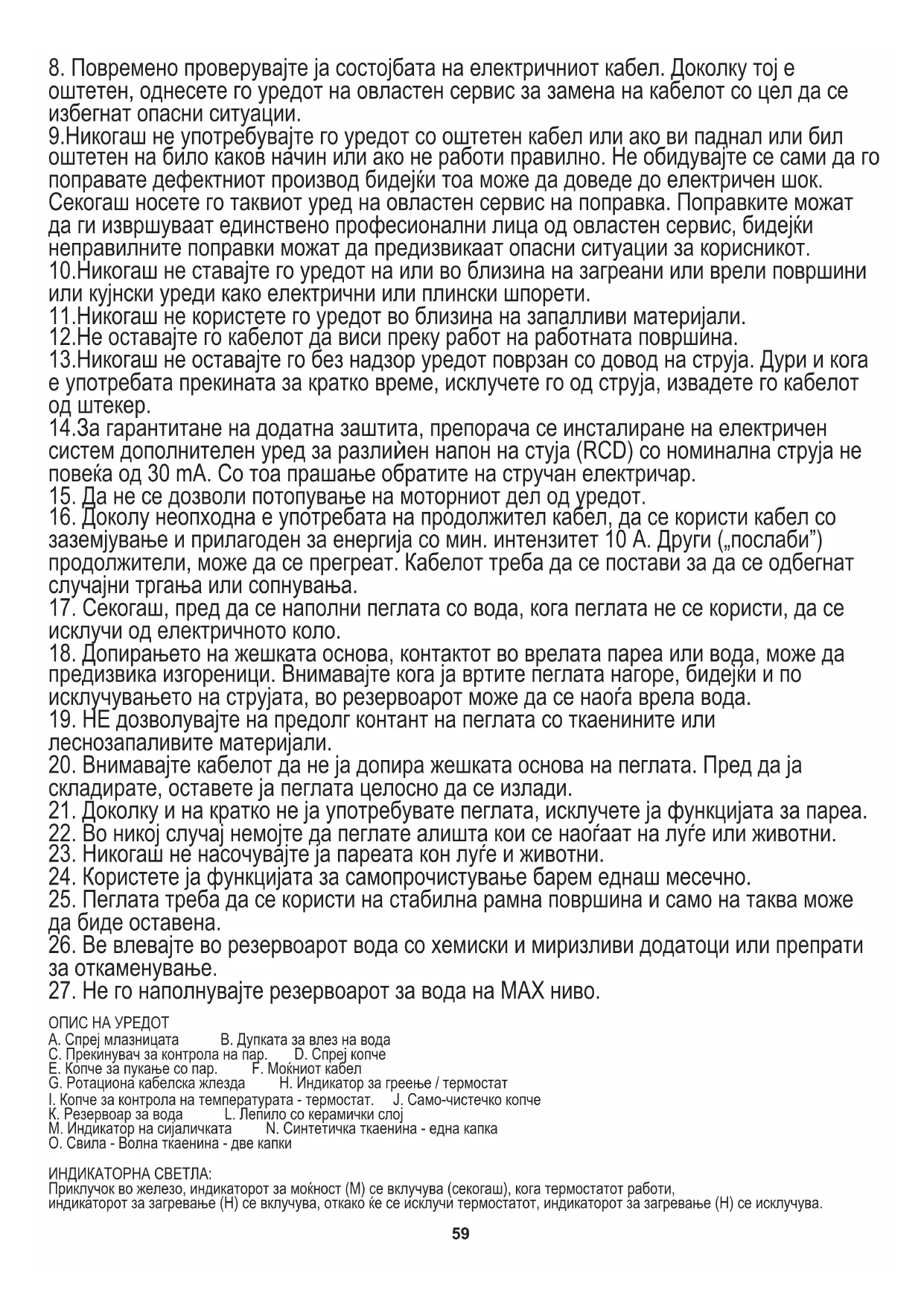 предизвика изгореници. Внимавајте кога ја вртите пеглата нагоре, бидејќи и по исклучувањето на струјата, во резервоарот може да се наоѓа врела вода. 12.Не оставајте го кабелот да виси преку работ на работната површина. 14.За гарантитане на додатна заштита, препорача се инсталиране на електричен систем дополнителен уред за разлиѝен напон на стуја (RCD) со номинална струја не повеќа од 30 mA. Со тоа прашање обратите на стручан електричар.