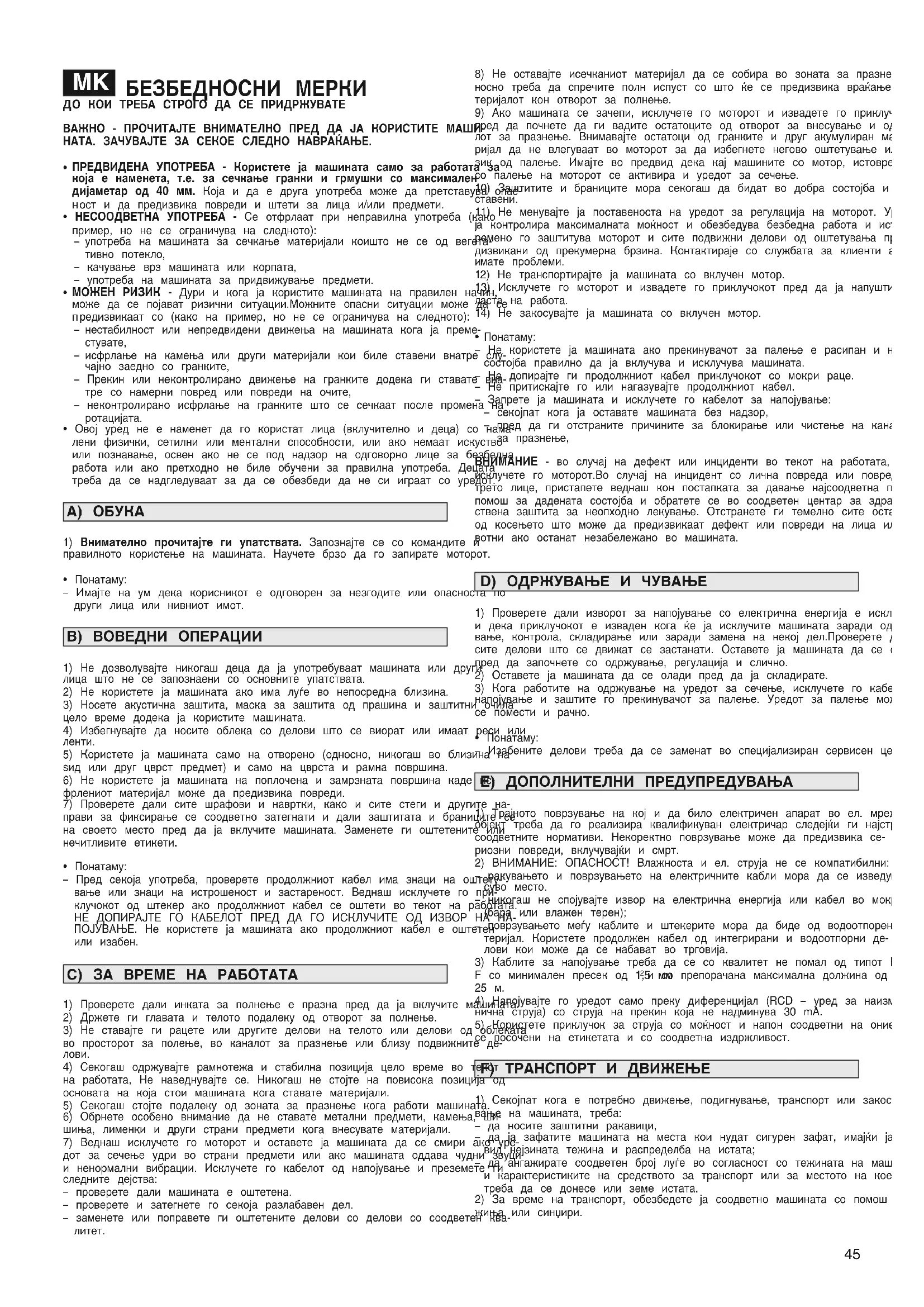 – Избегнувајте појава на елементи што го нарушуваат не- посредното опкружување. – Следете ги точно локалните закони за фрлање на мате- ријалите кои ќе се резултат на сечењето. – Доследно следете ги локалните закони за фрлање на ам- балажата, делови во распаѓање или какви било елементи со штетно влијание врз животната средина. Овие отпа- доци не смее да се фрлаат во ѓубре, туку треба да се се- лектираат и да се однесат во соодветни собирни центри за рециклирање материјали. – При исфрлање од употреба, не оставајте ја машината каде било во природата, туку предајте ја во собирен цен- тар во согласност со важечките локални закони. Во случај на какво било двоумење или проблем, контакти- рајте со Овластениот сервис во непосредна близина или со Застапникот.