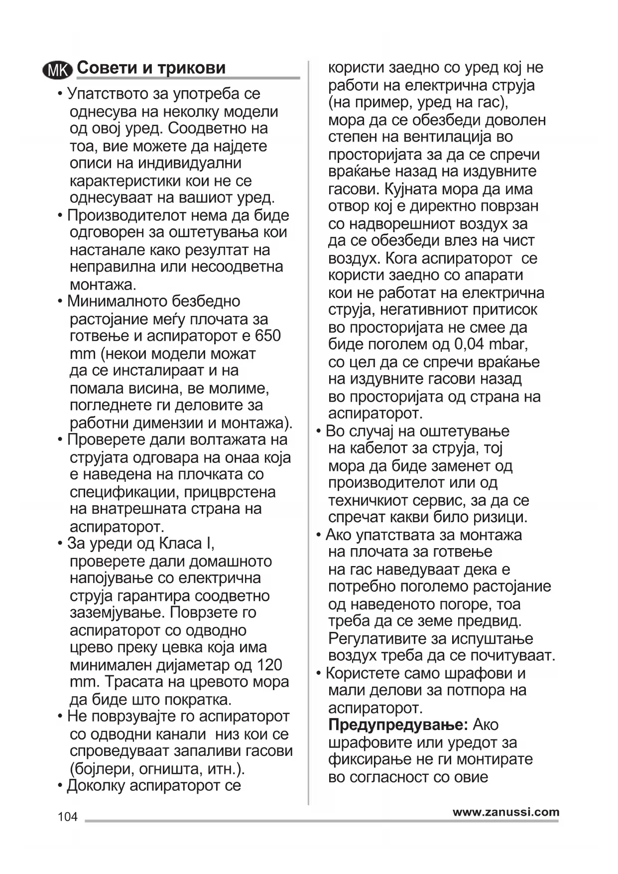 - Користете само шрафови и мали делови за потпора на аспираторот. Предупредување: Ако шрафовите или уредот за фиксирање не ги монтирате во согласност со овие MK105 www.zanussi.com упатства, може да дојде опасности поврзани со