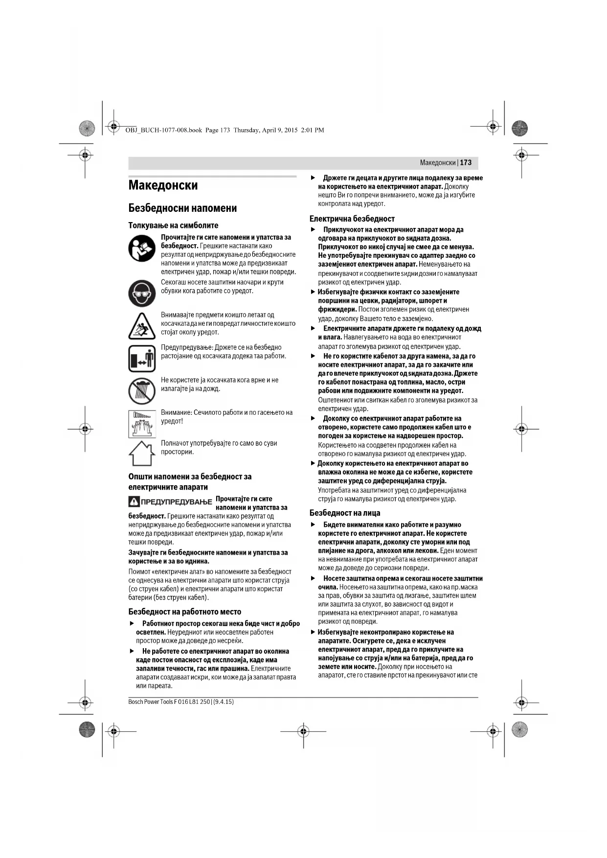 OBJ_BUCH-1077-008.book Page 174 Thursday, April 9, 2015 2:01 PMМакедонски | 175 Bosch Power Tools F 016 L81 250 | (9.4.15) Безбедносни напомени за тримерот за грмушки и трева Оваа косачка не е наменета на личности (и деца) со ограничени физички, сензорни или душевни можности, со недостаток на искуство и знаење, освен ако не им се обезбедени соодветни инструкции или надзор за употреба на косачката од страна на личност одговорна за нивната безбедност. Внимавајте децата да не си играат со косачката. Никогаш не дозволувајте им на деца и луѓе кои не се запознаени со овие инструкции да ја користат косачката. Локалните прописи можат да ја ограничат возраста на ракувачот. Чувајте ја косачката вон дофат на деца кога не ја употребувате. Ракувачот е одговорен за штетата нанесена на други луѓе или имот. Не користете ја машината кога во непосредна близина има животни, луѓе, а особено деца. Држете го кабелот понастрана од