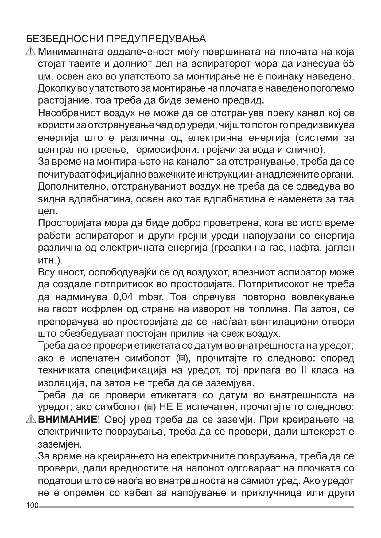 Всушност, ослободувајќи се од воздухот, влезниот аспиратор може да создаде потпритисок во просторијата. Потпритисокот не треба да надминува 0,04 mbar. Тоа спречува повторно вовлекување на гасот исфрлен од страна на изворот на топлина. Па затоа, се препорачува во просторијата да се наоѓаат вентилациони отвори што обезбедуваат постојан прилив на свеж воздух. Треба да се провери етикетата со датум во внатрешноста на уредот; ако е испечатен симболот ( ), прочитајте го следново: според техничката спецификација на уредот, тој припаѓа во II класа на изолација, па затоа не треба да се заземјува. Треба да се провери етикетата со датум во внатрешноста на уредот; ако симболот ( ) НЕ Е испечатен, прочитајте го следново: ВНИМАНИЕ! Овој уред треба да се заземји. При креирањето на електричните поврзувања, треба да се провери, дали штекерот е