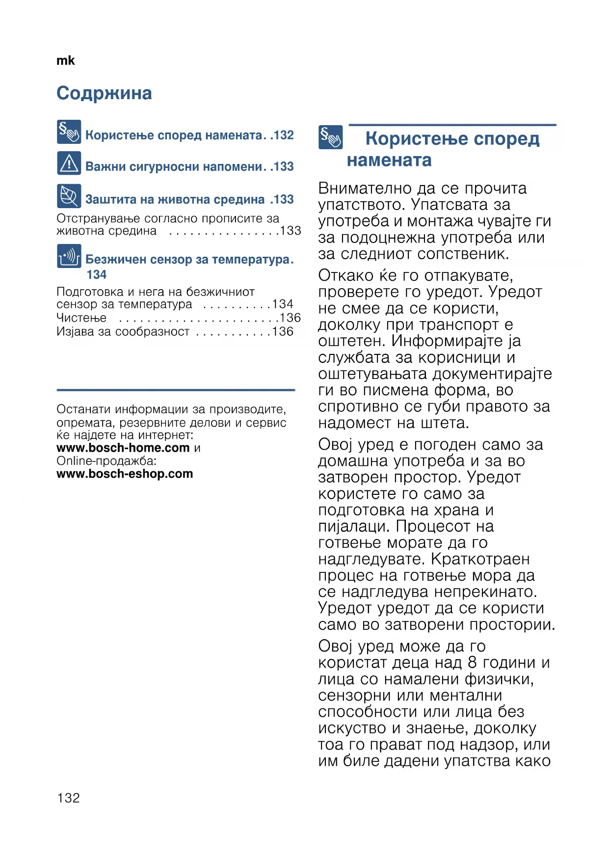 Подготовка и нега на безжичниот сензор за температура . . . . . . . . . .134 Чистење . . . . . . . . . . . . . . . . . . . . . . .136 Изјава за сообразност . . . . . . . . . . .136 Информации за производот Останати информации за производите, опремата, резервните делови и сервис ќе најдете на интернет: www.bosch-home.com и Online-продажба: www.bosch-eshop.com 8 Користење според