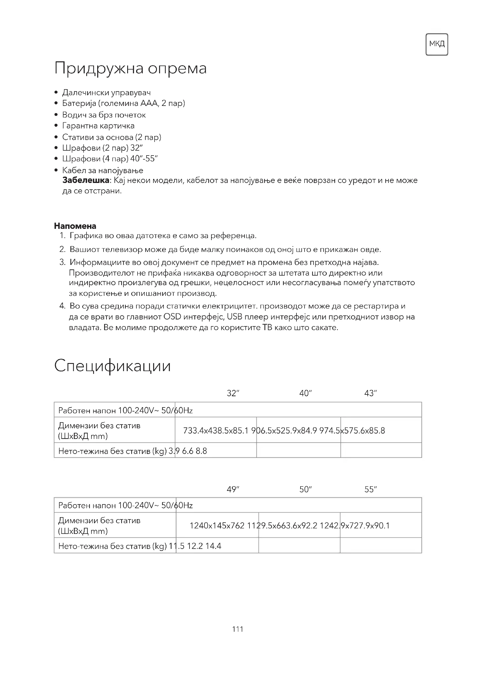 да се врати во главниот OSD интерфејс, USB плеер интерфејс или претходниот извор на владата. Ве молиме продолжете да го користите ТВ како што сакате. 32” 49” 40” 50” Работен напон 100-240V~ 50/60Hz Димензии без статив (ШxВxД mm) 733.4x438.5x85.1 906.5x525.9x84.9 974.5x575.6x85.8 Нето-тежина без статив (kg) 3.9 6.6 8.8 Работен напон 100-240V~ 50/60Hz Димензии без статив (ШxВxД mm) 1240x145x762 1129.5x663.6x92.2 1242.9x727.9x90.1 Нето-тежина без статив (kg) 11.5 12.2 14.4 43” 55”112
