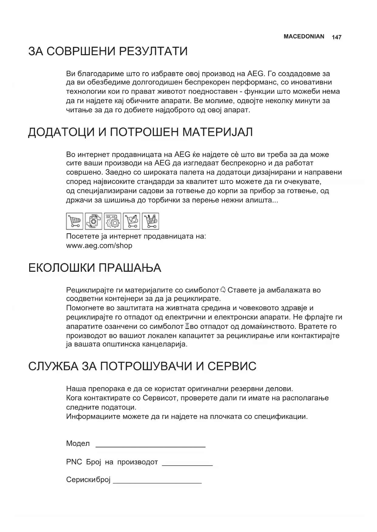 - Ауыстыру үшін, техникалық қолдау көрсету орталығымен хабарласыңыз («Сатып алу үшін, техникалық қызмет көрсету орталығымен хабарласыңыз»).147 MACEDONIAN ЗА СОВРШЕНИ РЕЗУЛТАТИ Ви благодариме што го избравте овој производ на AEG. Го создадовме за да ви обезбедиме долгогодишен беспрекорен перформанс, со иновативни технологии кои го прават животот поедноставен - функции што можеби нема да ги најдете кај обичните апарати. Ве молиме, одвојте неколку минути за читање за да го добиете најдоброто од овој апарат. ДОДАТОЦИ И ПОТРОШЕН МАТЕРИЈАЛ Во интернет продавницата на AEG ќе најдете сè што ви треба за да може сите ваши производи на AEG да изгледаат беспрекорно и да работат совршено. Заедно со широката палета на додатоци дизајнирани и направени според највисоките стандарди за квалитет што можете да ги очекувате, од специјализирани садови за готвење до корпи за прибор за готвење, од држачи за шишиња до торбички за перење нежни алишта... Посетете ја интернет продавницата на: www.aeg.com/shop ЕКОЛОШКИ ПРАШАЊА Рециклирајте ги материјалите со симболот . Ставете ја амбалажата во соодветни контејнери за да ја рециклирате. Помогнете во заштитата на живтната средина и човековото здравје и рециклирајте го отпадот од електрични и електронски апарати. Не фрлајте ги апаратите озанчени со симболот во отпадот од домаќинството. Вратете го производот во вашиот локален капацитет за рециклирање или контактирајте ја вашата општинска канцеларија. СЛУЖБА ЗА ПОТРОШУВАЧИ И СЕРВИС Наша препорака е да се користат оригинални резервни делови. Кога контактирате со Сервисот, проверете дали ги имате на располагање следните податоци. Информациите можете да ги најдете на плочката со спецификации. Модел __________________________ PNC Број на производот ____________ Сериски број _____________________148 www.aeg.com