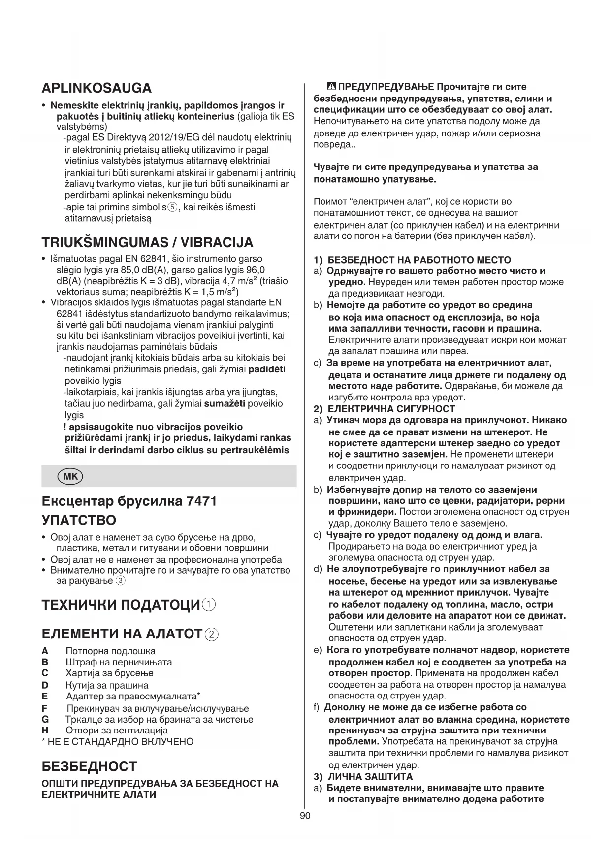 ОПШТИ ПРЕДУПРЕДУВАЊА ЗА БЕЗБЕДНОСТ НА ЕЛЕКТРИЧНИТЕ АЛАТИ91 или кои го немаат прочитано ова упатство. Електричните алати се опасни доколку со нив работат неискусни лица. e) Одржувајте го електричниот алат и дополнителната опрема. Имајте контрола околу тоа дали движечките делови на уредот работат беспрекорно и дали не се заглавени, дали деловите се скршени или оштетени до таа мерка што не може да се обезбеди функционирање на уредот. Пред примената, овие оштетени делови треба да се поправат. Причина за многу незгоди е лошо одржуваниот електричен алат. f) Алатите за сечење одржувајте ги остри и чисти. Внимателно одржуваните алати за сечење со остри очтрици помалку ќе се заглавуваат и со нив работата ќе биде полесна. g) Електричниот алат, прибор, работни алати итн., треба да ги користите според овие упатства, и на начин кој е опишан за соодветниот тип на уред. При тоа, земете ги предвид работните услови и работата која се извршува. Употребата на електричните алати за други цели кои не се предвидени, може да предизвика опасни ситуации. h) Рачките и површините за држење одржувајте ги суви, чисти и неизмастени. Рачките и површините за држење што се лизгаат не овозможуваат безбедно ракување и контрола на алатот во неочекувани ситуации.