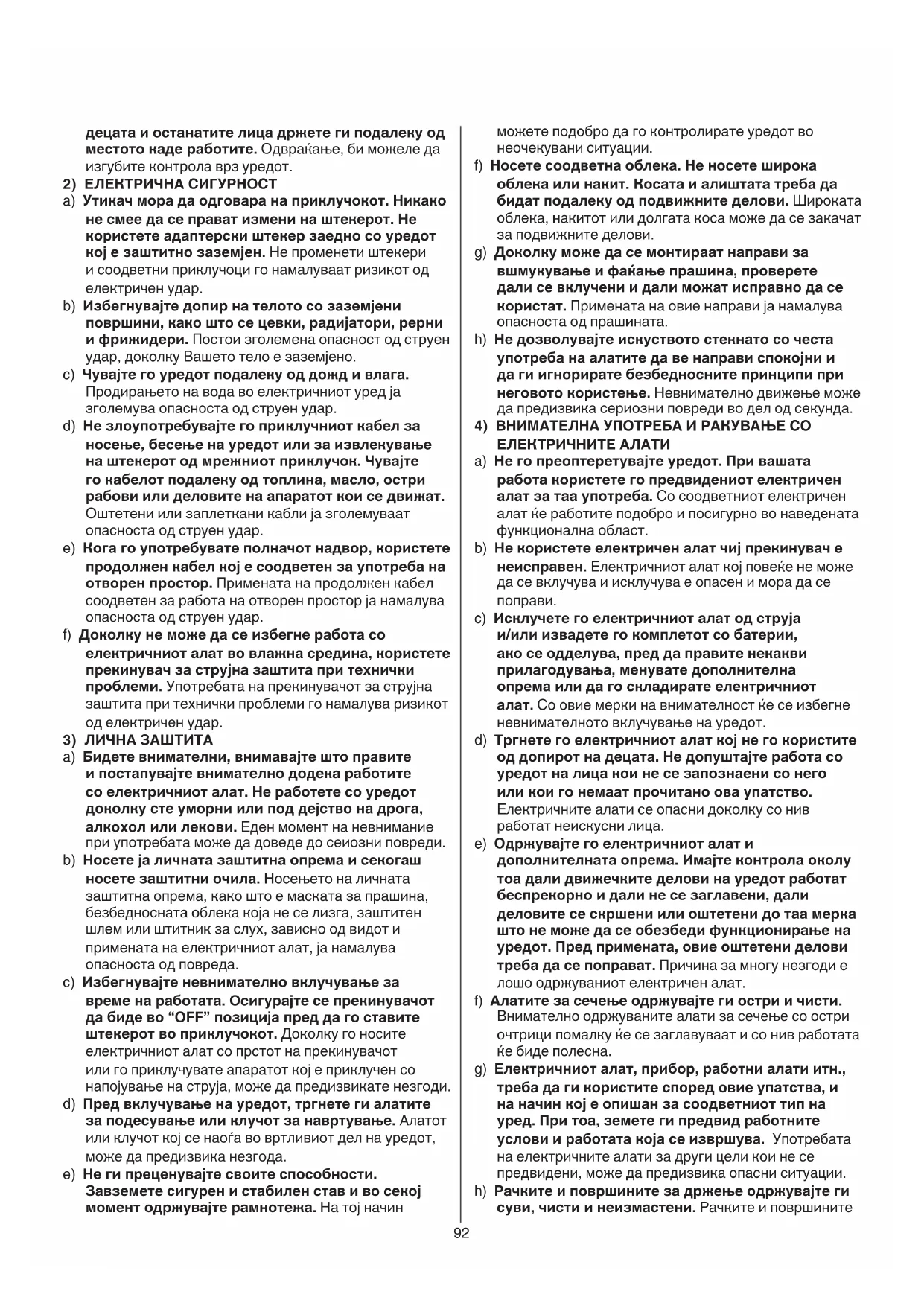 a) Бидете внимателни, внимавајте што правите и постапувајте внимателно додека работите со електричниот алат. Не работете со уредот доколку сте уморни или под дејство на дрога, алкохол или лекови. Еден момент на невнимание при употребата може да доведе до сеиозни повреди. b) Носете ја личната заштитна опрема и секогаш носете заштитни очила. Носењето на личната заштитна опрема, како што е маската за прашина, безбедносната облека која не се лизга, заштитен шлем или штитник за слух, зависно од видот и примената на електричниот алат, ја намалува опасноста од повреда. c) Избегнувајте невнимателно вклучување за време на работата. Осигурајте се прекинувачот да биде во “OFF” позиција пред да го ставите штекерот во приклучокот. Доколку го носите електричниот алат со прстот на прекинувачот или го приклучувате апаратот кој е приклучен со напојување на струја, може да предизвикате незгоди. d) Пред вклучување на уредот, тргнете ги алатите за подесување или клучот за навртување. Алатот или клучот кој се наоѓа во вртливиот дел на уредот, може да предизвика незгода. e) Не ги преценувајте своите способности. Завземете сигурен и стабилен став и во секој момент одржувајте рамнотежа. На тој начин93