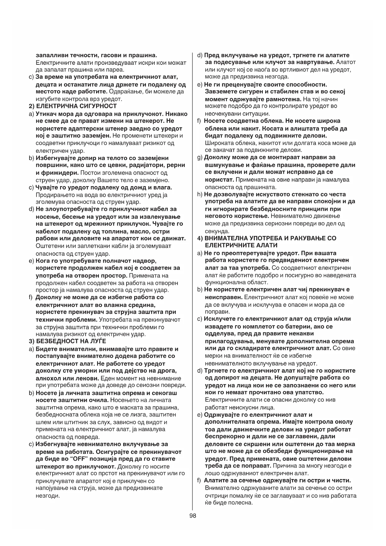a) Одржувајте го вашето работно место чисто и уредно. Неуреден или темен работен простор може да предизвикаат незгоди. b) Немојте да работите со уредот во средина во која има опасност од експлозија, во која има98 запалливи течности, гасови и прашина. Електричните алати произведуваат искри кои можат да запалат прашина или пареа. c) За време на употребата на електричниот алат, децата и останатите лица држете ги подалеку од местото каде работите. Одвраќање, би можеле да изгубите контрола врз уредот.