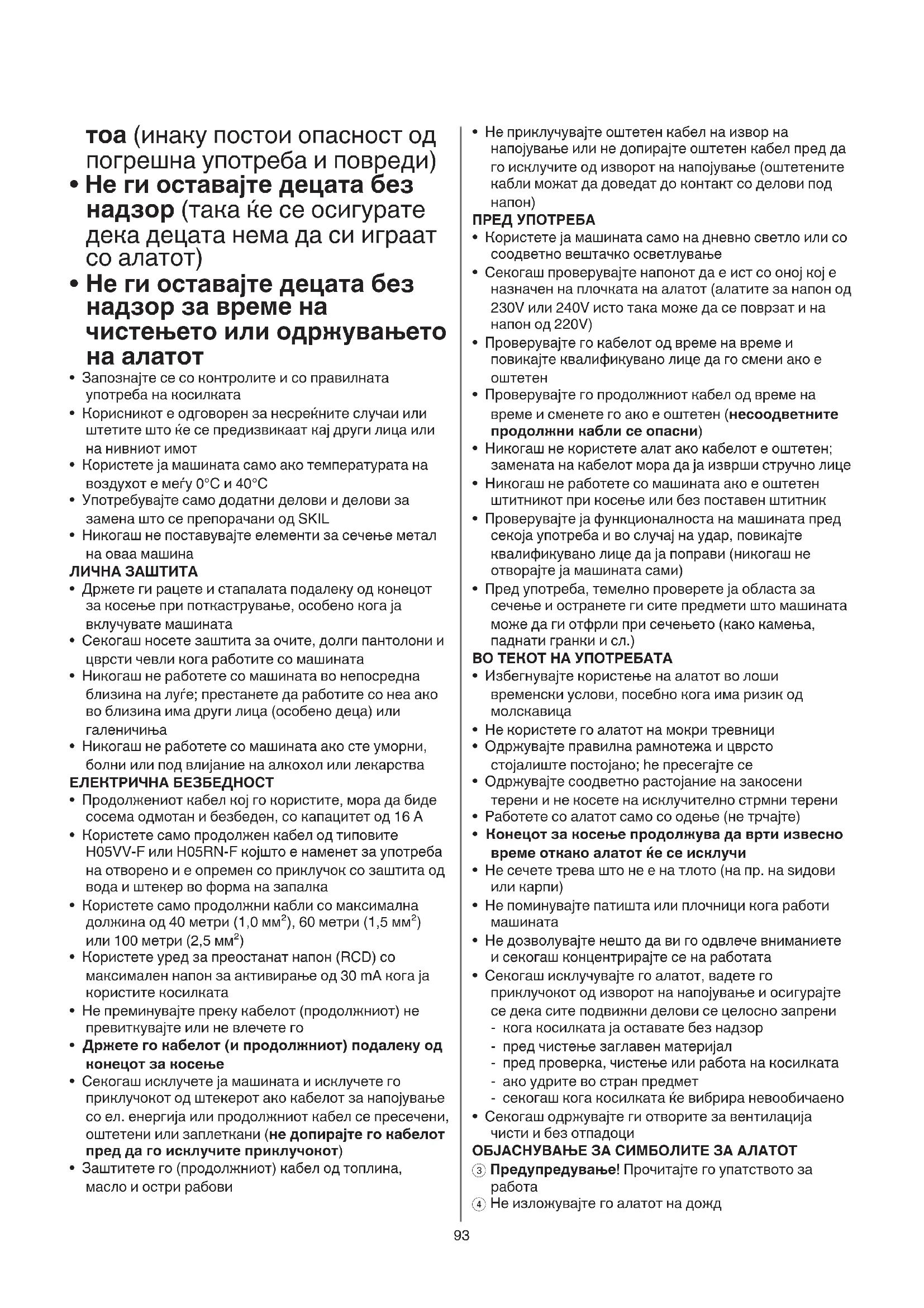4 Не изложувајте го алатот на дожд94 5 Носете заштитни очила и заштита за ушите 6 Обрнете внимание на ризикот од повреда што може да го предизвика отфрлениот остаток од косењето (присутните лица да стојат на безбедно растојание од местото на работа) 7 Веднаш извлечете го приклучокот ако кабелот (и продолжниот) се оштети или пресече во текот на