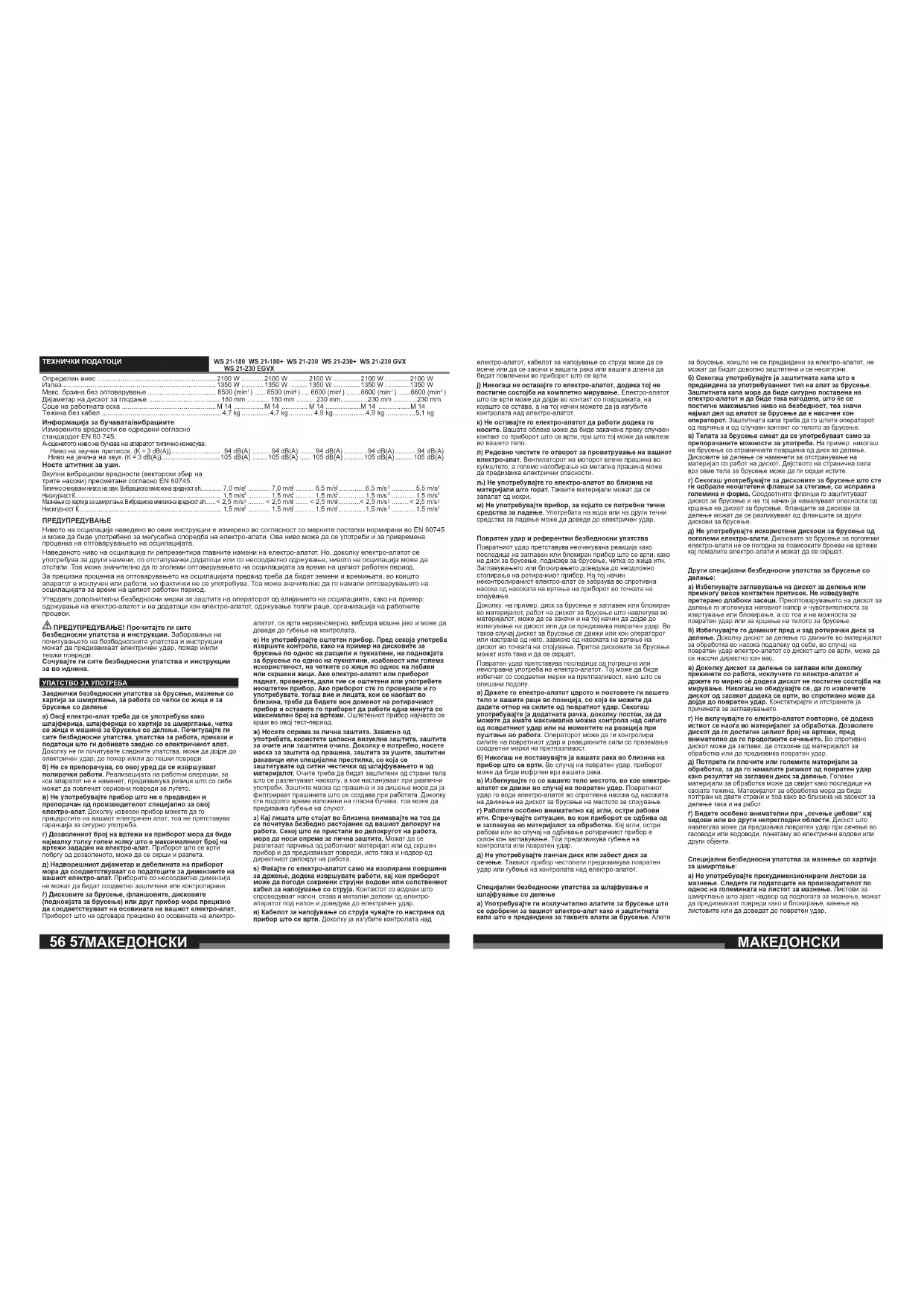 СПЕЦИФИЦИРАНИ УСЛОВИ НА УПОТРЕБА Аголната брусилка се употребува за делење и брусење со гребење (грубо гребење) на голем број материјали како на пример на метал или камен, како и за мазнење на подлоги за мазнење на пластика и за работа со четка со челична жица. Во секој случај почитувајте ги упатствата на производителите на приборот. Не го користете овој производ на било кој друг начин освен пропишаниот за нормална употреба. ЕУ‑ДЕКЛАРАЦИЈА ЗА СООБРАЗНОСТ Ние во целосна одговорност изјавуваме дека овој производ е во сообразност со следните стандарди и стандардизирани документи. EN 60745, EN 55014-1, EN 55014-2, EN 61000-3-2, EN 61000-3-3 (WS 21-180+, WS 21-230+, WS 21-230 GVX, WS 21-230 EGVX), EN 61000-3-11 (WS 21-180, WS 21-230), и е во согласност со прописите 98/37/EC, 2004/108/EC Rainer Kumpf Manager Product Development Winnenden, 2009-07-27 ГЛАВНИ ВРСКИ Да се спои само за една фаза АС коло и само на главниот напон наведен на плочката. Можно е исто така и поврзување на приклучок без заземјување доколку изведбата соодветствува на безбедност од 2