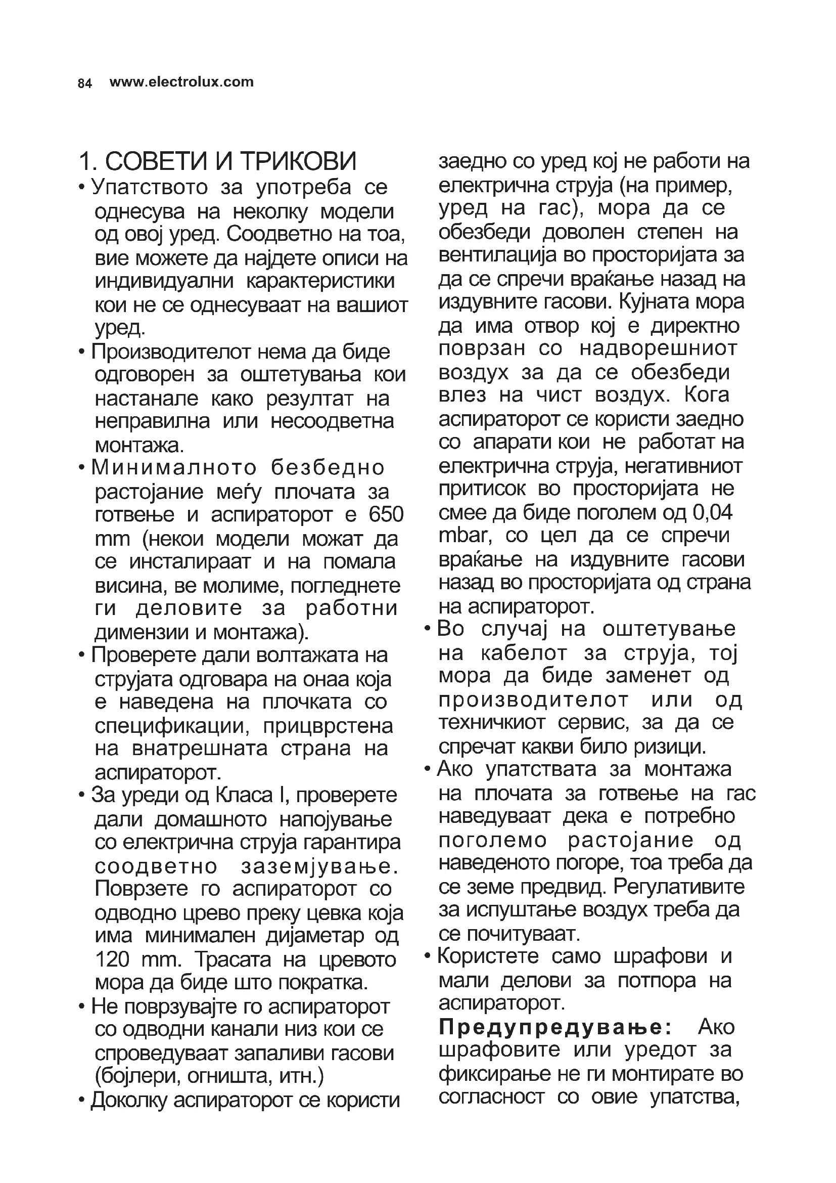 - Доколку аспираторот се користи заедно со уред кој не работи на електрична струја (на пример, уред на гас), мора да се обезбеди доволен степен на вентилација во просторијата за да се спречи враќање назад на издувните гасови. Кујната мора да има отвор кој е директно поврзан со надворешниот воздух за да се обезбеди влез на чист воздух. Кога аспираторот се користи заедно со апарати кои не работат на електрична струја, негативниот притисок во просторијата не смее да биде поголем од 0,04 mbar, со цел да се спречи враќање на издувните гасови назад во просторијата од страна на аспираторот.