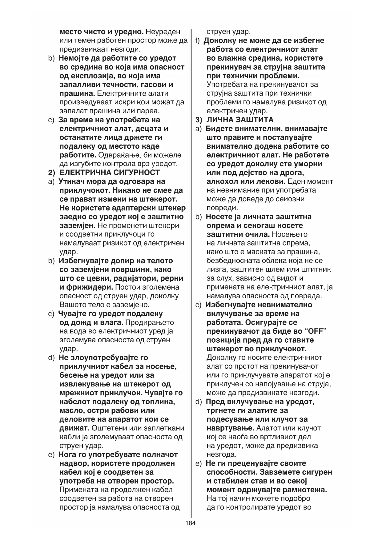 a) Електричниот алат сервисирајте го кај квалификувано лице кое користи само идентични резервни делови. Со ова се обезбедува безбедно одржување на електричниот алат.187