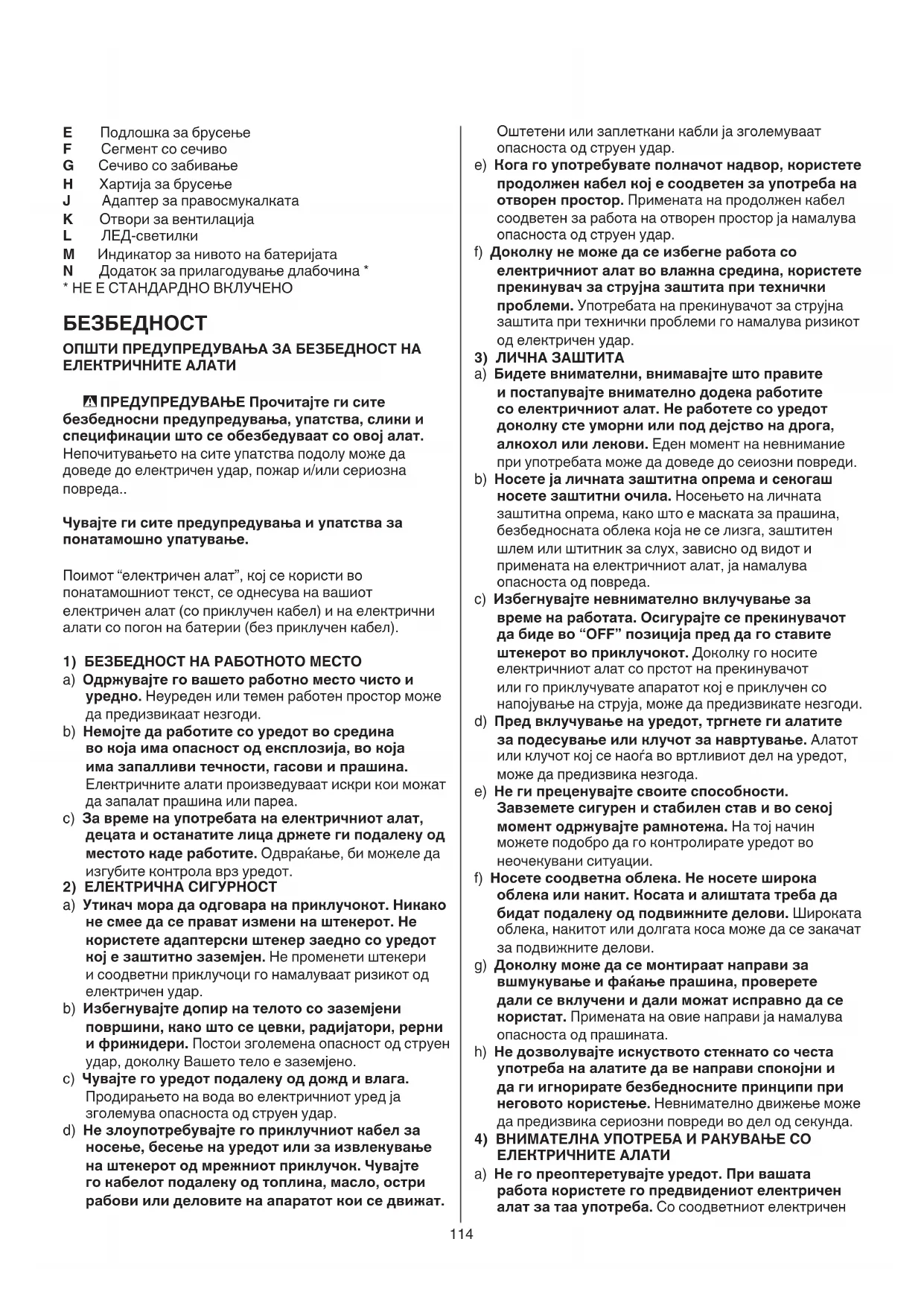 ЕЛЕКТРИЧНИТЕ АЛАТИ a) Не го преоптеретувајте уредот. При вашата работа користете го предвидениот електричен алат за таа употреба. Со соодветниот електричен E Подлошка за брусење F Сегмент со сечиво G Сечиво со забивање H Хартија за брусење J Адаптер за правосмукалката K Отвори за вентилација L ЛЕД-светилки M Индикатор за нивото на батеријата N Додаток за прилагодување длабочина *