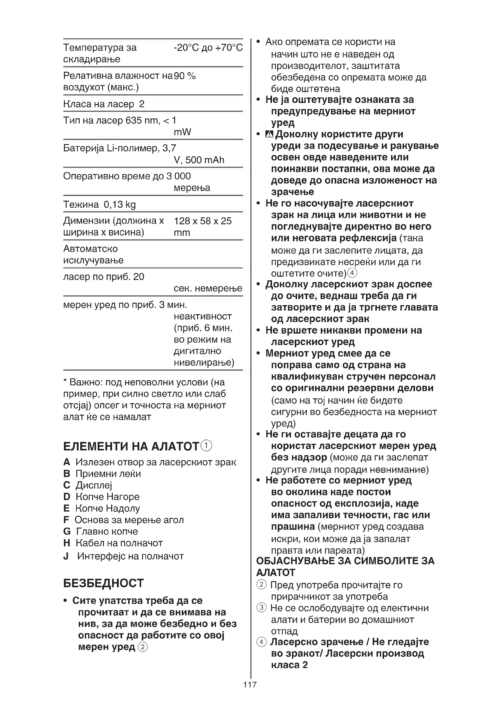 - Важно: под неповолни услови (на пример, при силно светло или слаб отсјај) опсег и точноста на мерниот алат ќе се намалат ЕЛЕМЕНТИ НА АЛАТОТ