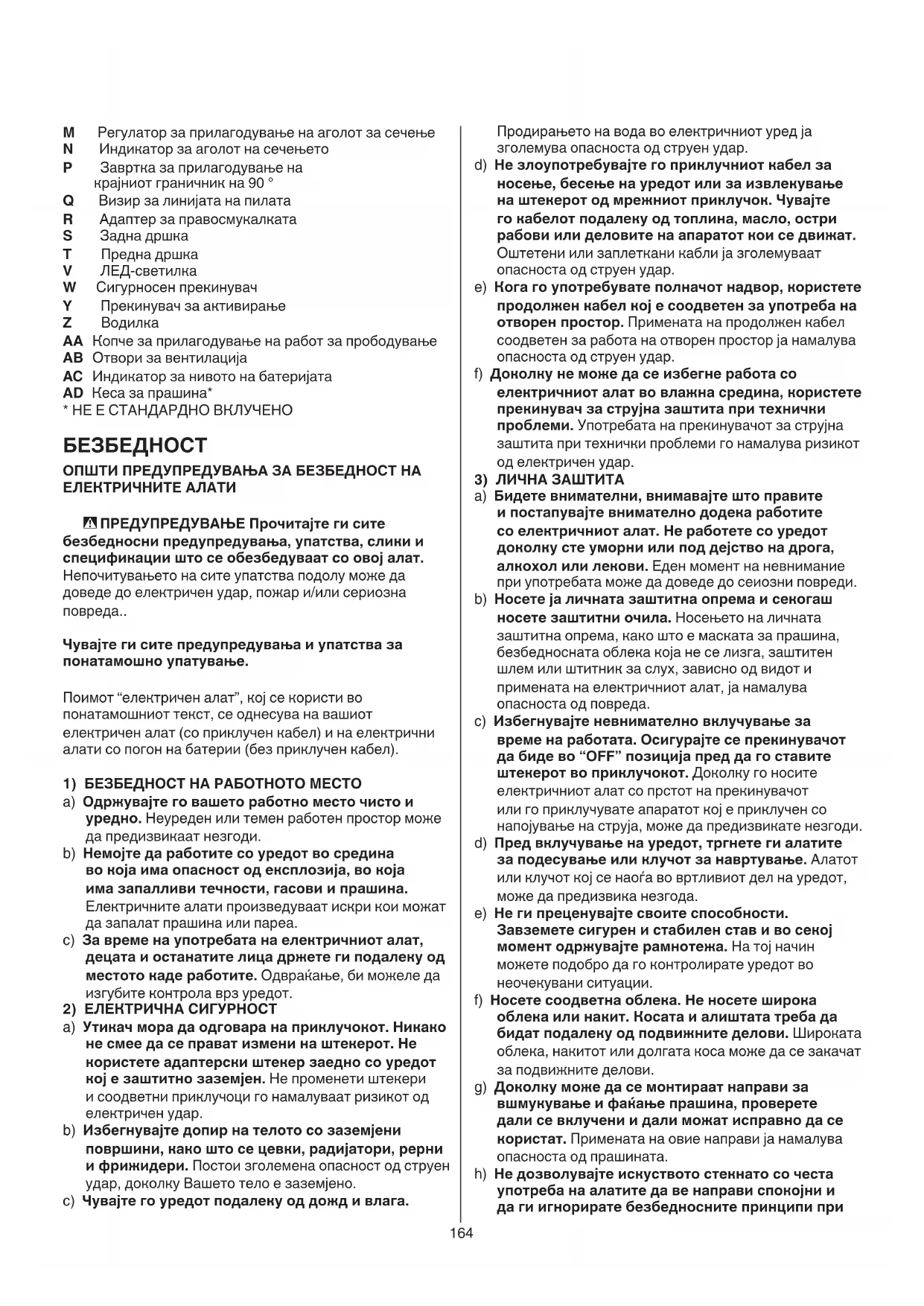 a) Бидете внимателни, внимавајте што правите и постапувајте внимателно додека работите со електричниот алат. Не работете со уредот доколку сте уморни или под дејство на дрога, алкохол или лекови. Еден момент на невнимание при употребата може да доведе до сеиозни повреди. b) Носете ја личната заштитна опрема и секогаш носете заштитни очила. Носењето на личната заштитна опрема, како што е маската за прашина, безбедносната облека која не се лизга, заштитен шлем или штитник за слух, зависно од видот и примената на електричниот алат, ја намалува опасноста од повреда. c) Избегнувајте невнимателно вклучување за време на работата. Осигурајте се прекинувачот да биде во “OFF” позиција пред да го ставите штекерот во приклучокот. Доколку го носите електричниот алат со прстот на прекинувачот или го приклучувате апаратот кој е приклучен со напојување на струја, може да предизвикате незгоди. d) Пред вклучување на уредот, тргнете ги алатите за подесување или клучот за навртување. Алатот или клучот кој се наоѓа во вртливиот дел на уредот, може да предизвика незгода. e) Не ги преценувајте своите способности. Завземете сигурен и стабилен став и во секој момент одржувајте рамнотежа. На тој начин можете подобро да го контролирате уредот во неочекувани ситуации. f) Носете соодветна облека. Не носете широка облека или накит. Косата и алиштата треба да бидат подалеку од подвижните делови. Широката облека, накитот или долгата коса може да се закачат за подвижните делови. g) Доколку може да се монтираат направи за вшмукување и фаќање прашина, проверете дали се вклучени и дали можат исправно да се користат. Примената на овие направи ја намалува опасноста од прашината. h) Не дозволувајте искуството стекнато со честа употреба на алатите да ве направи спокојни и да ги игнорирате безбедносните принципи при M Регулатор за прилагодување на аголот за сечење N Индикатор за аголот на сечењето P Завртка за прилагодување на крајниот граничник на 90 ° Q Визир за линијата на пилата R Адаптер за правосмукалката S Задна дршка T Предна дршка V ЛЕД-светилка W Сигурносен прекинувач Y Прекинувач за активирање Z Водилка AA Копче за прилагодување на работ за прободување AB Отвори за вентилација AC Индикатор за нивото на батеријата AD Кеса за прашина*