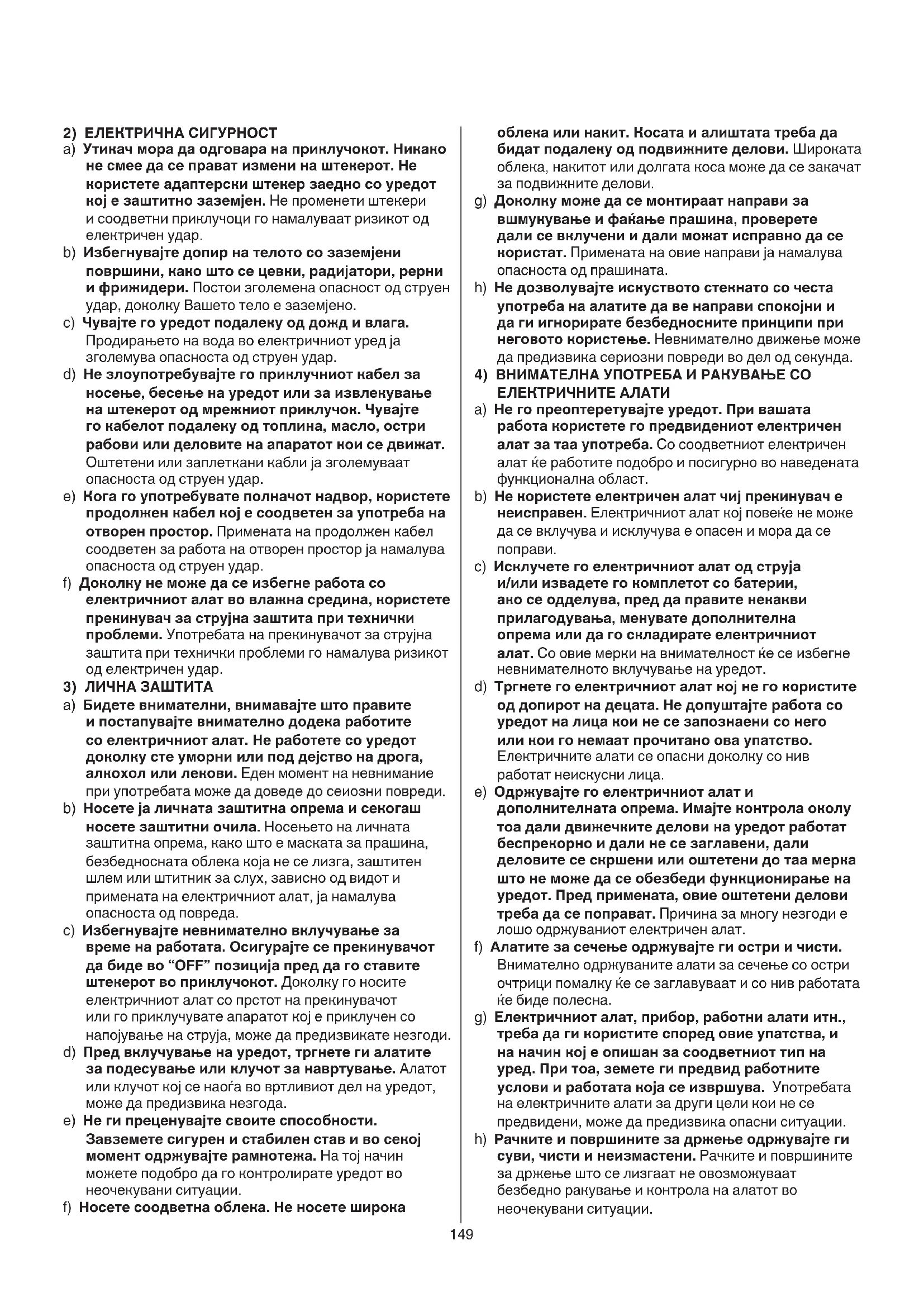ЕЛЕКТРИЧНИТЕ АЛАТИ a) Не го преоптеретувајте уредот. При вашата работа користете го предвидениот електричен алат за таа употреба. Со соодветниот електричен алат ќе работите подобро и посигурно во наведената функционална област. b) Не користете електричен алат чиј прекинувач е неисправен. Електричниот алат кој повеќе не може да се вклучува и исклучува е опасен и мора да се
