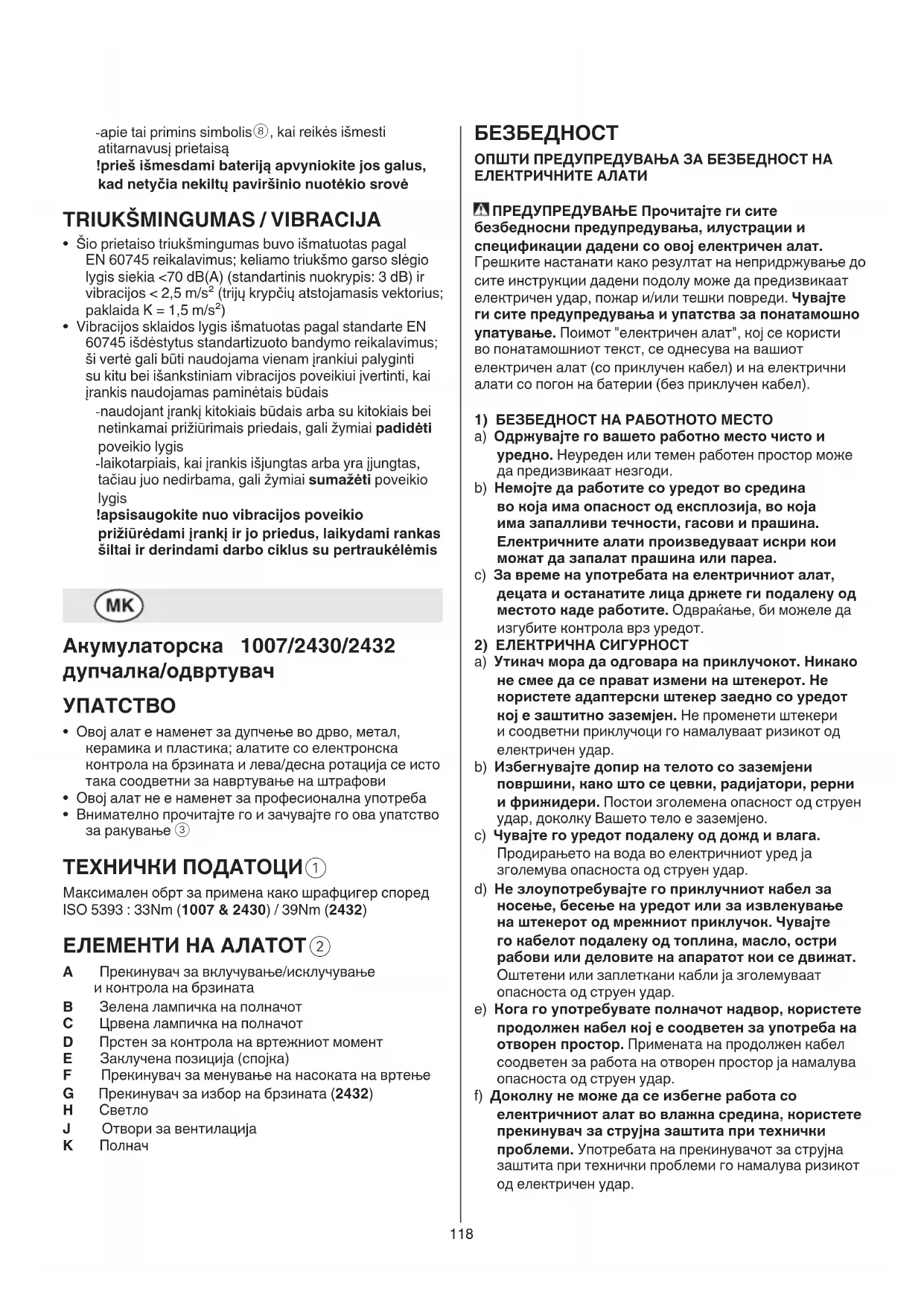 A Прекинувач за вклучување/исклучување и контрола на брзината B Зелена лампичка на полначот C Црвена лампичка на полначот D Прстен за контрола на вртежниот момент E Заклучена позиција (спојка) F Прекинувач за менување на насоката на вртење G Прекинувач за избор на брзината (2432) H Светло J Отвори за вентилација K Полнач119 d) Тргнете го електричниот алат кој не го користите од допирот на децата. Не допуштајте работа со уредот на лица кои не се запознаени со него или кои го немаат прочитано ова упатство. Електричните алати се опасни доколку со нив работат неискусни лица. e) Одржувајте го електричниот алат и дополнителната опрема. Имајте контрола околу тоа дали движечките делови на уредот работат беспрекорно и дали не се заглавени, дали деловите се скршени или оштетени до таа мерка што не може да се обезбеди функционирање на уредот. Пред примената, овие оштетени делови треба да се поправат. Причина за многу незгоди е лошо одржуваниот електричен алат. f) Алатите за сечење одржувајте ги остри и чисти. Внимателно одржуваните алати за сечење со остри очтрици помалку ќе се заглавуваат и со нив работата ќе биде полесна. g) Електричниот алат, прибор, работни алати итн., треба да ги користите според овие упатства, и на начин кој е опишан за соодветниот тип на уред. При тоа, земете ги предвид работните услови и работата која се извршува. Употребата на електричните алати за други цели кои не се предвидени, може да предизвика опасни ситуации. h) Рачките и површините за држење одржувајте ги суви, чисти и неизмастени. Рачките и површините за држење што се лизгаат не овозможуваат безбедно ракување и контрола на алатот во неочекувани ситуации.