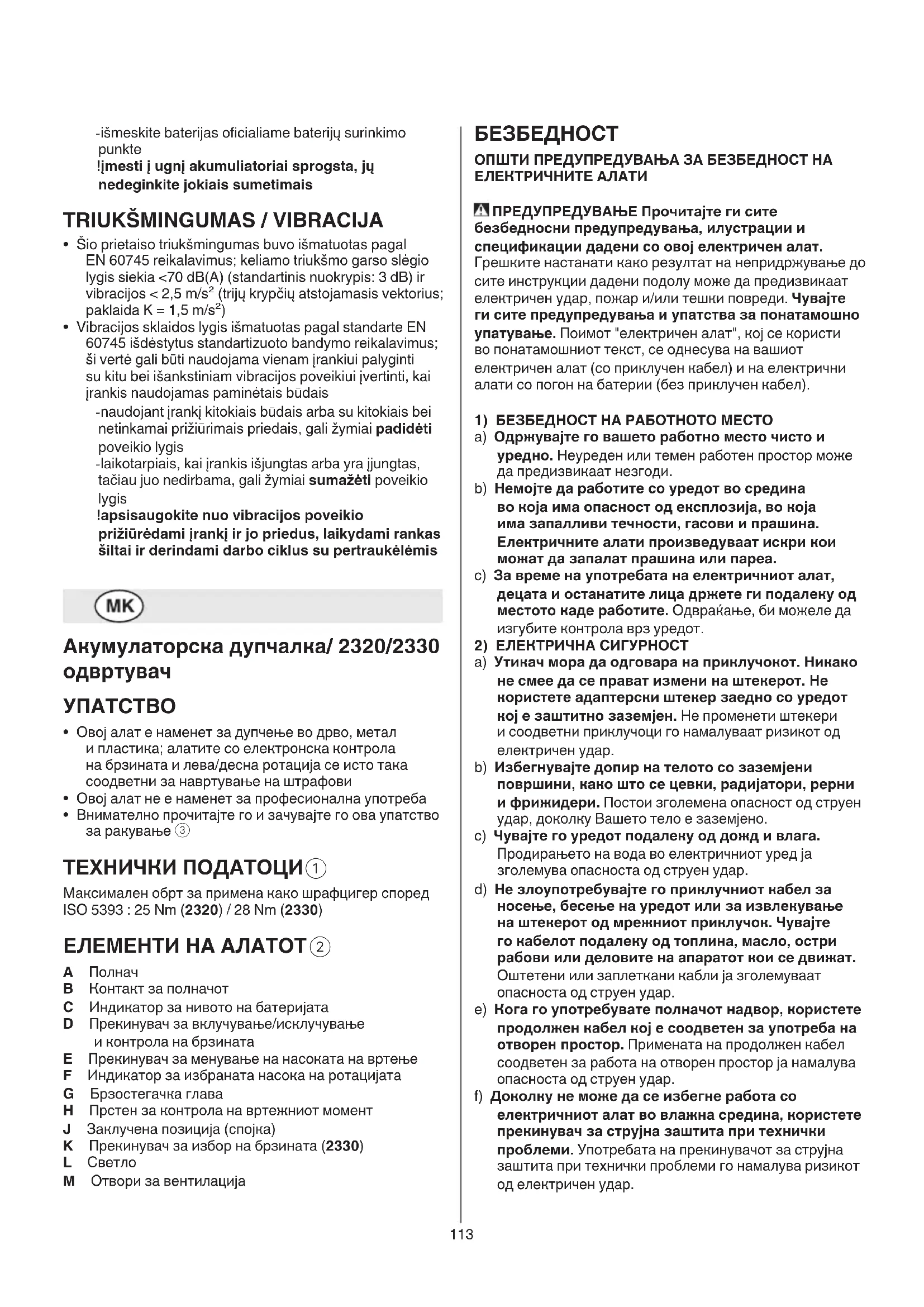 A Полнач B Контакт за полначот C Индикатор за нивото на батеријата D Прекинувач за вклучување/исклучување и контрола на брзината E Прекинувач за менување на насоката на вртење F Индикатор за избраната насока на ротацијата G Брзостегачка глава H Прстен за контрола на вртежниот момент J Заклучена позиција (спојка) K Прекинувач за избор на брзината (2330) L Светло M Отвори за вентилација114 d) Тргнете го електричниот алат кој не го користите од допирот на децата. Не допуштајте работа со уредот на лица кои не се запознаени со него или кои го немаат прочитано ова упатство. Електричните алати се опасни доколку со нив работат неискусни лица. e) Одржувајте го електричниот алат и дополнителната опрема. Имајте контрола околу тоа дали движечките делови на уредот работат беспрекорно и дали не се заглавени, дали деловите се скршени или оштетени до таа мерка што не може да се обезбеди функционирање на уредот. Пред примената, овие оштетени делови треба да се поправат. Причина за многу незгоди е лошо одржуваниот електричен алат. f) Алатите за сечење одржувајте ги остри и чисти. Внимателно одржуваните алати за сечење со остри очтрици помалку ќе се заглавуваат и со нив работата ќе биде полесна. g) Електричниот алат, прибор, работни алати итн., треба да ги користите според овие упатства, и на начин кој е опишан за соодветниот тип на уред. При тоа, земете ги предвид работните услови и работата која се извршува. Употребата на електричните алати за други цели кои не се предвидени, може да предизвика опасни ситуации. h) Рачките и површините за држење одржувајте ги суви, чисти и неизмастени. Рачките и површините за држење што се лизгаат не овозможуваат безбедно ракување и контрола на алатот во неочекувани ситуации.