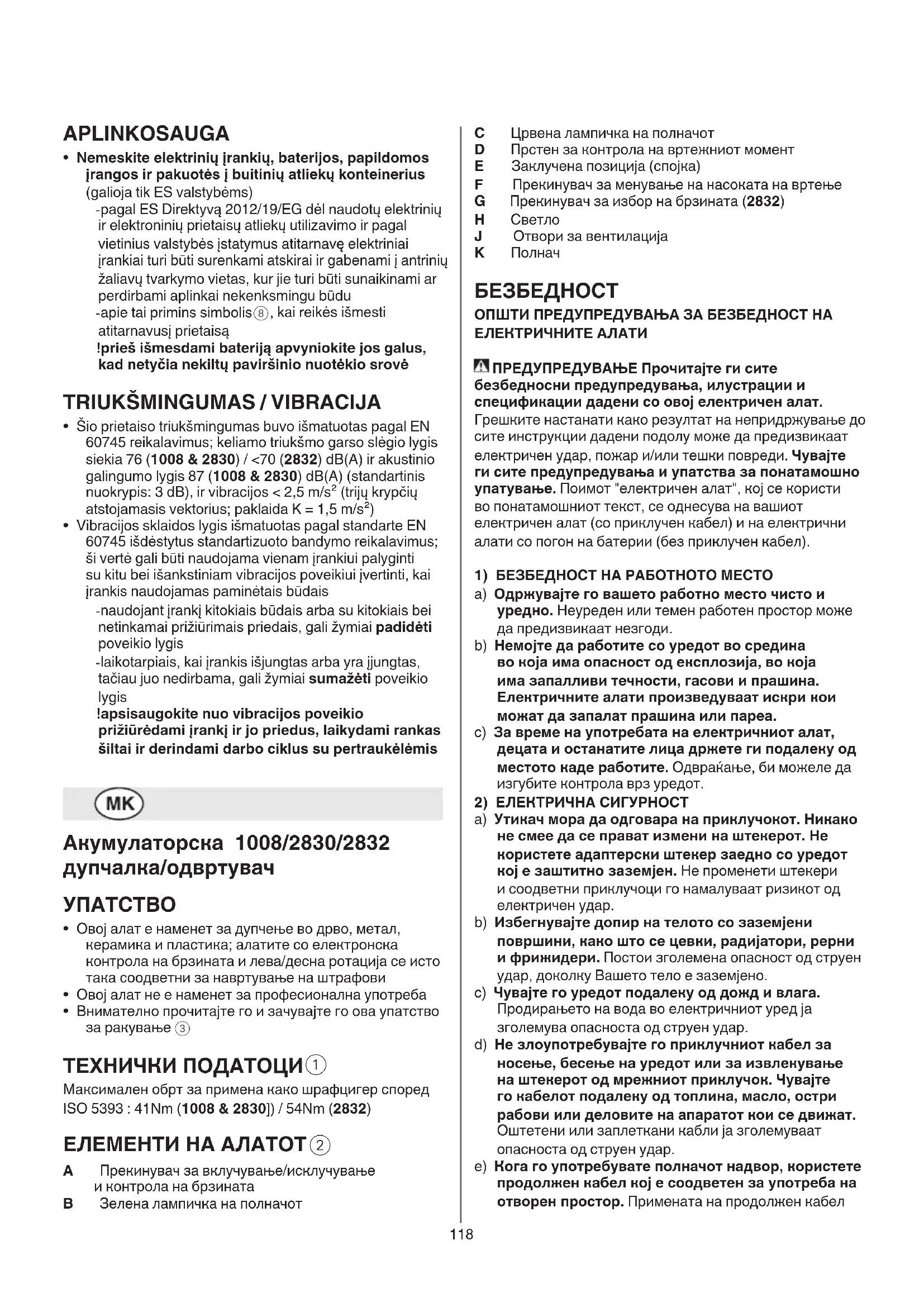 - кога алатот е исклучен или кога алатот е вклучен но не врши некаква работа, може да дојде до значително намалување на нивото а изложеност ! заштитете се од ефектите на вибрациите преку одржување на алатот и неговите делови, одржување на топлината во вашите раце, и организирање на вашата работа Trapano/vidator 1008/2830/2832 me bateri HYRJE