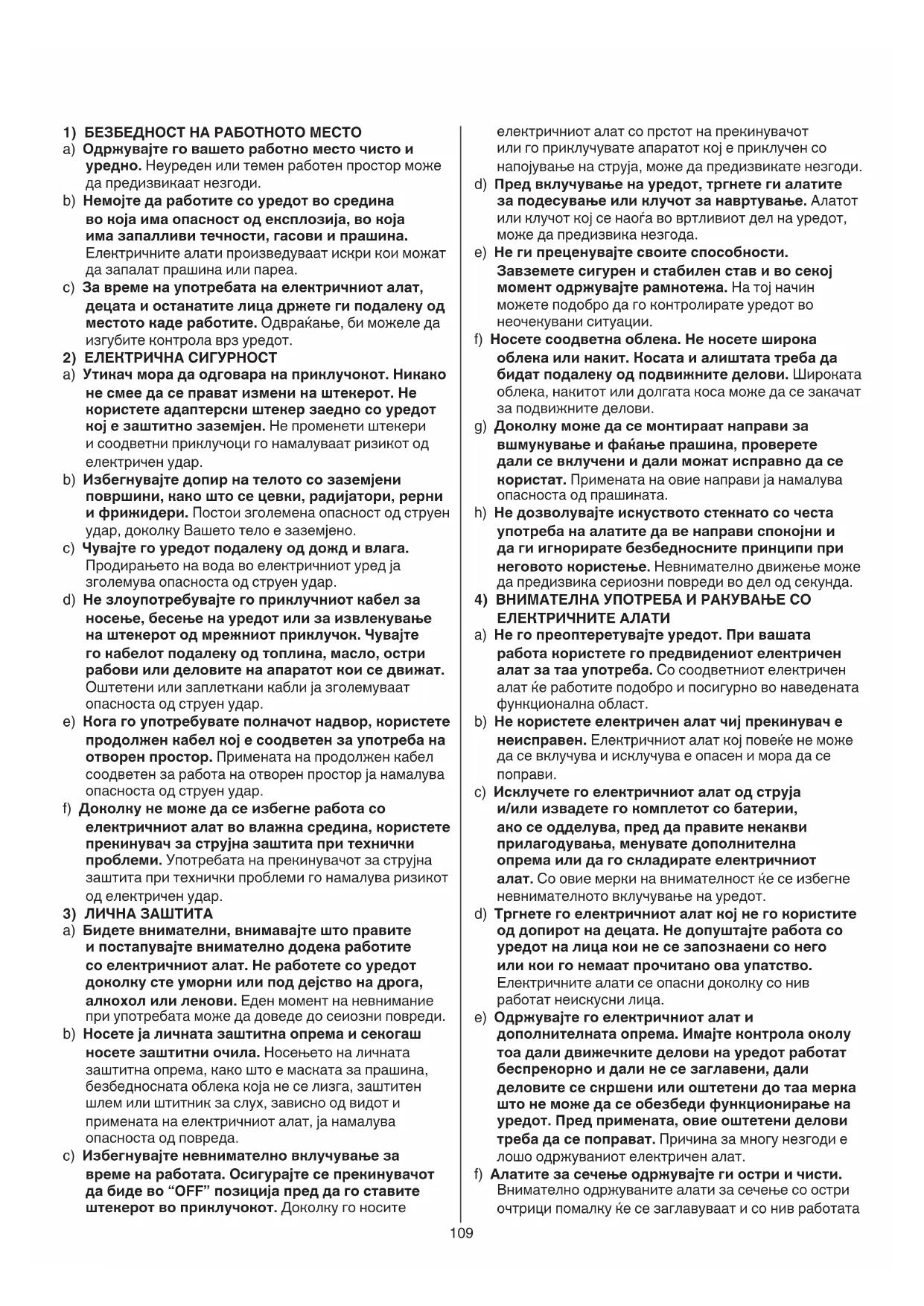 a) Бидете внимателни, внимавајте што правите и постапувајте внимателно додека работите со електричниот алат. Не работете со уредот доколку сте уморни или под дејство на дрога, алкохол или лекови. Еден момент на невнимание при употребата може да доведе до сеиозни повреди. b) Носете ја личната заштитна опрема и секогаш носете заштитни очила. Носењето на личната заштитна опрема, како што е маската за прашина, безбедносната облека која не се лизга, заштитен шлем или штитник за слух, зависно од видот и примената на електричниот алат, ја намалува опасноста од повреда. c) Избегнувајте невнимателно вклучување за време на работата. Осигурајте се прекинувачот да биде во “OFF” позиција пред да го ставите штекерот во приклучокот. Доколку го носите110 маска за прашина и работете со правосмукалки доколку можете да ги поврзете