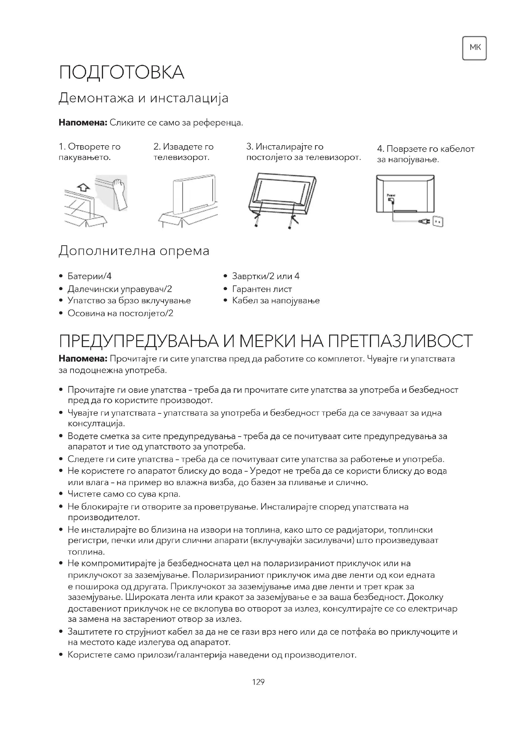 - Исклучете ја струјата пред да го преместувате или инсталирате телевизорот. Инаку може да дојде до струен удар.