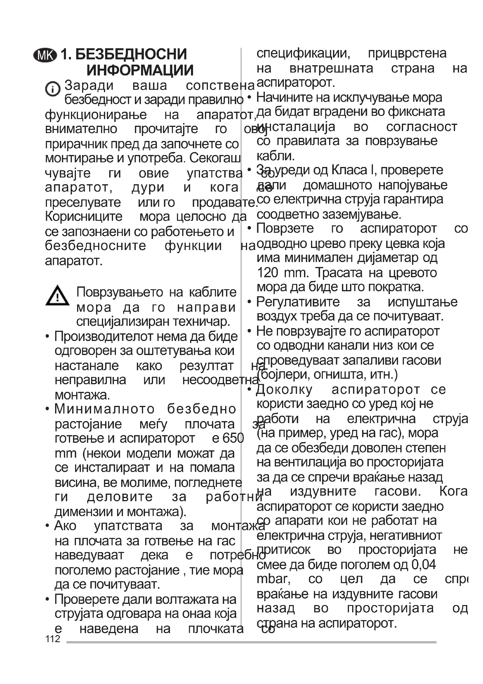 - Доколку аспираторот се користизаедносоуредкојне работи на електрична струја (например,уреднагас),мора дасеобезбедидоволенстепен навентилацијавопросторијата задасеспречивраќањеназад на издувните гасови. Кога аспираторотсекористизаедно соапаратикоинеработатна електричнаструја,негативниот притисок во просторијата не смеедабидепоголемод0,04 mbar, со цел да се спречи враќањенаиздувнитегасови назад во просторијата од странанааспираторот. MK113