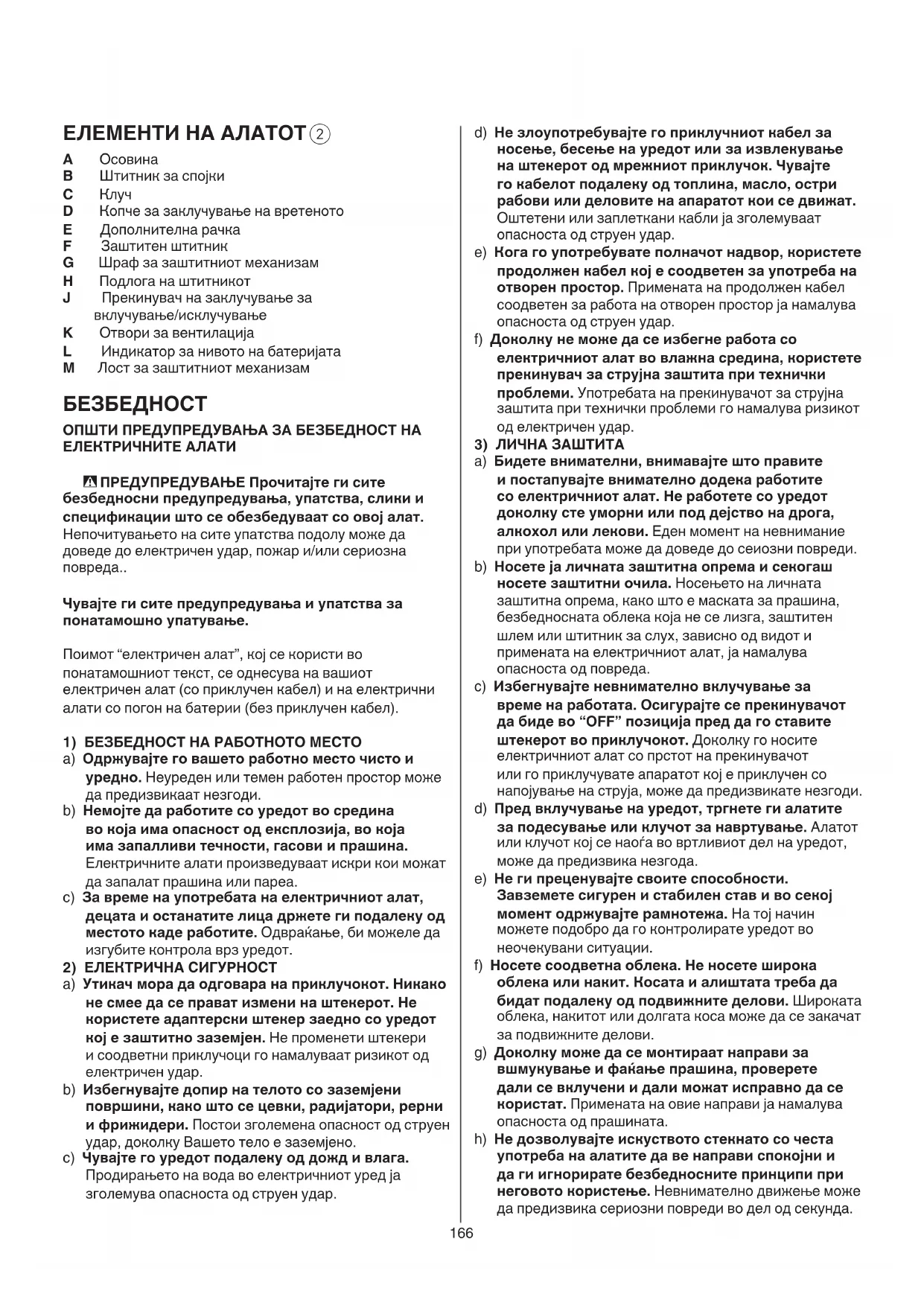 A Осовина B Штитник за спојки C Клуч D Копче за заклучување на вретеното E Дополнителна рачка F Заштитен штитник G Шраф за заштитниот механизам H Подлога на штитникот J Прекинувач на заклучување за вклучување/исклучување K Отвори за вентилација L Индикатор за нивото на батеријата M Лост за заштитниот механизам